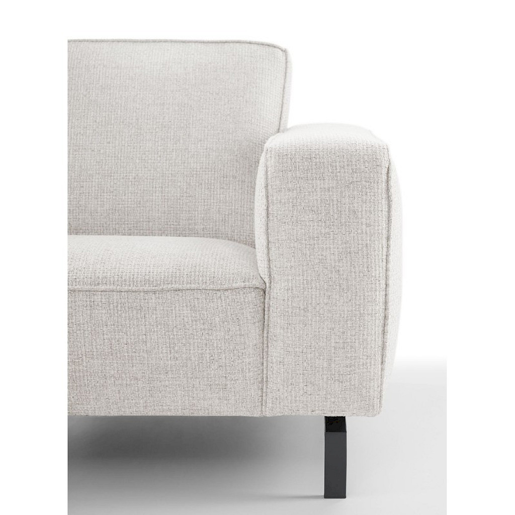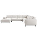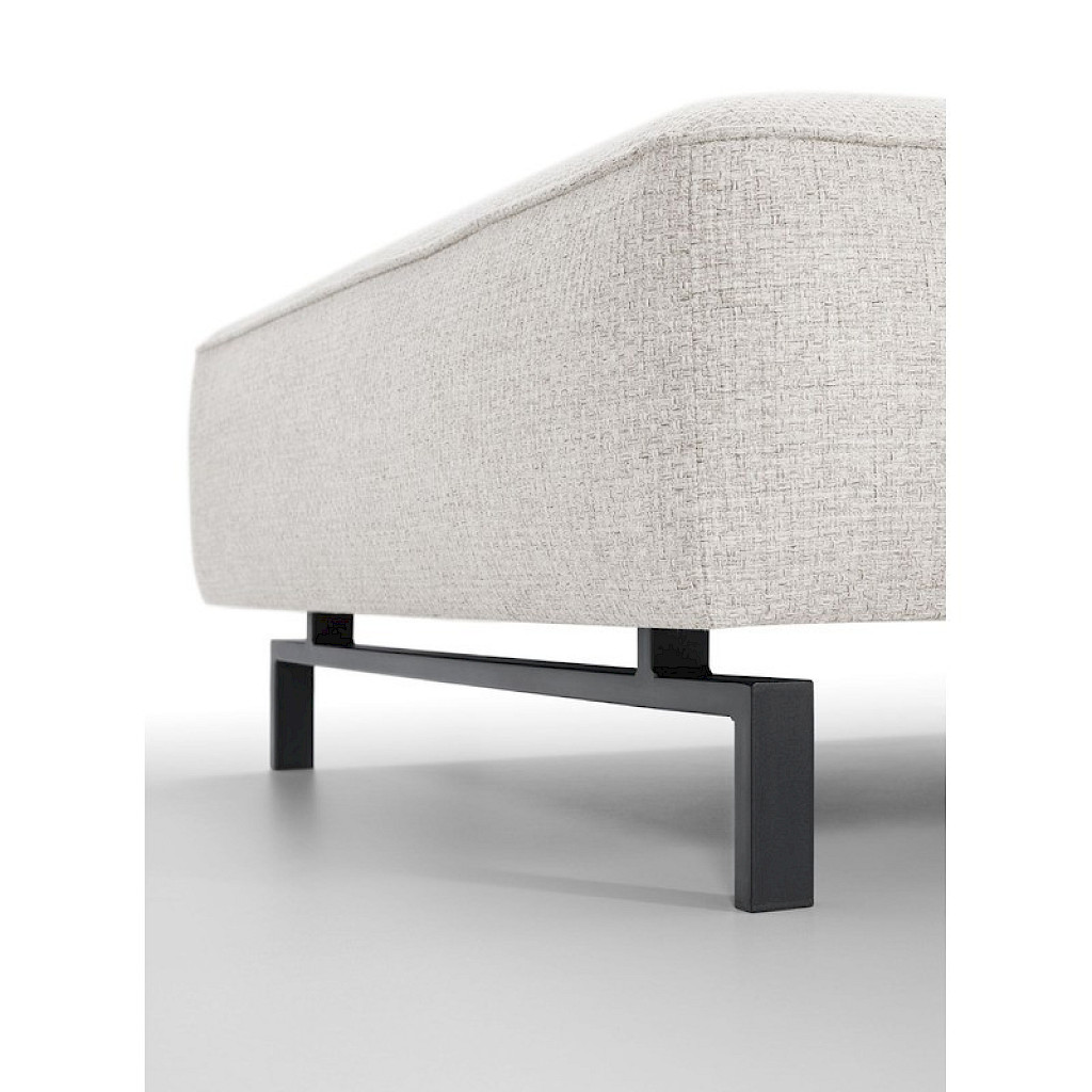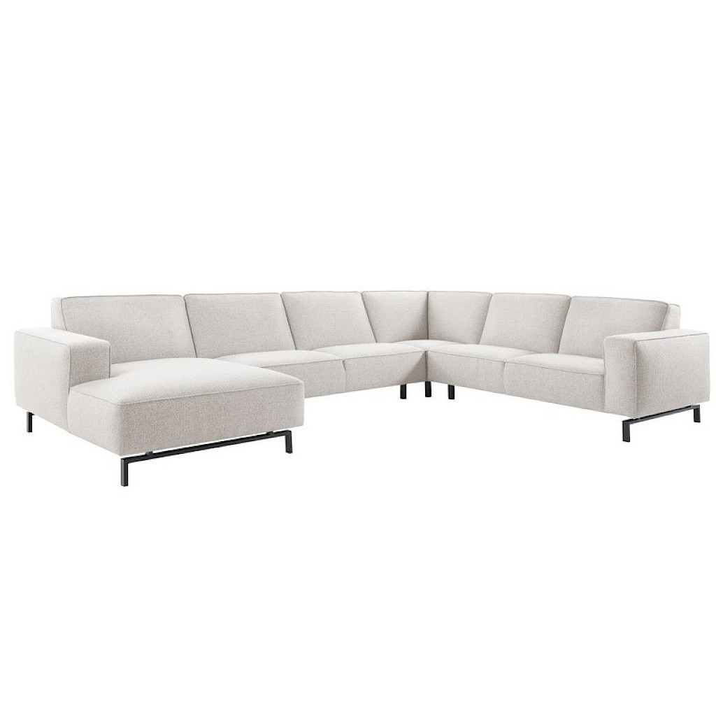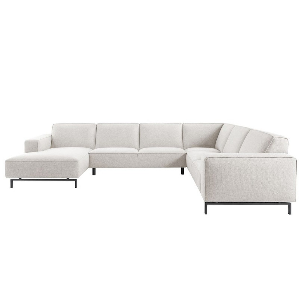 Longchair arm links + 2,5 zits zonder armen + hoekelement + 2,5 zits arm rechts uitgevoerd in stof florence 5515-white grey met arm A (recht), HR-schuim in de zitting (standaard zitcomfort) en zwarte metalen sledepoten.