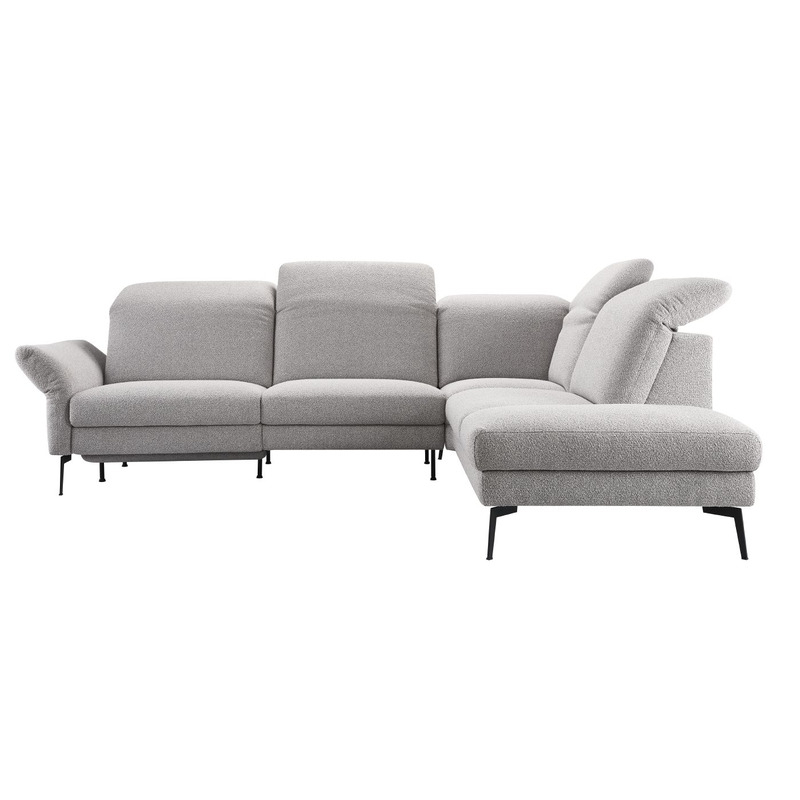 2,5 zits arm links + hoek met eiland rechts in de stof cosmo 120 light grey met verstelbare arm. zwarte metalen poten 18 cm, elektrische relax functie inclusief accu en pocketveren in de zitting. Daarnaast zijn alle hoofdsteunen te verstellen.