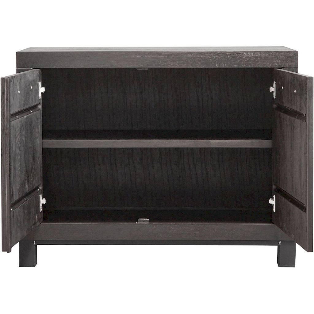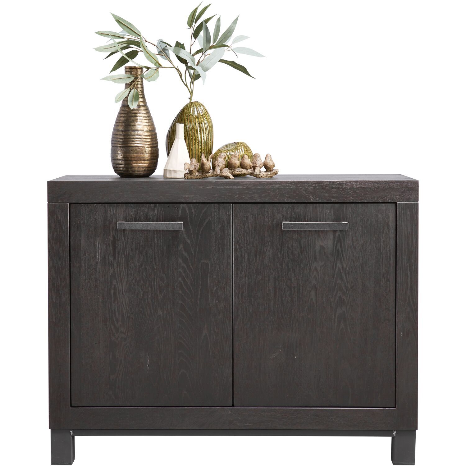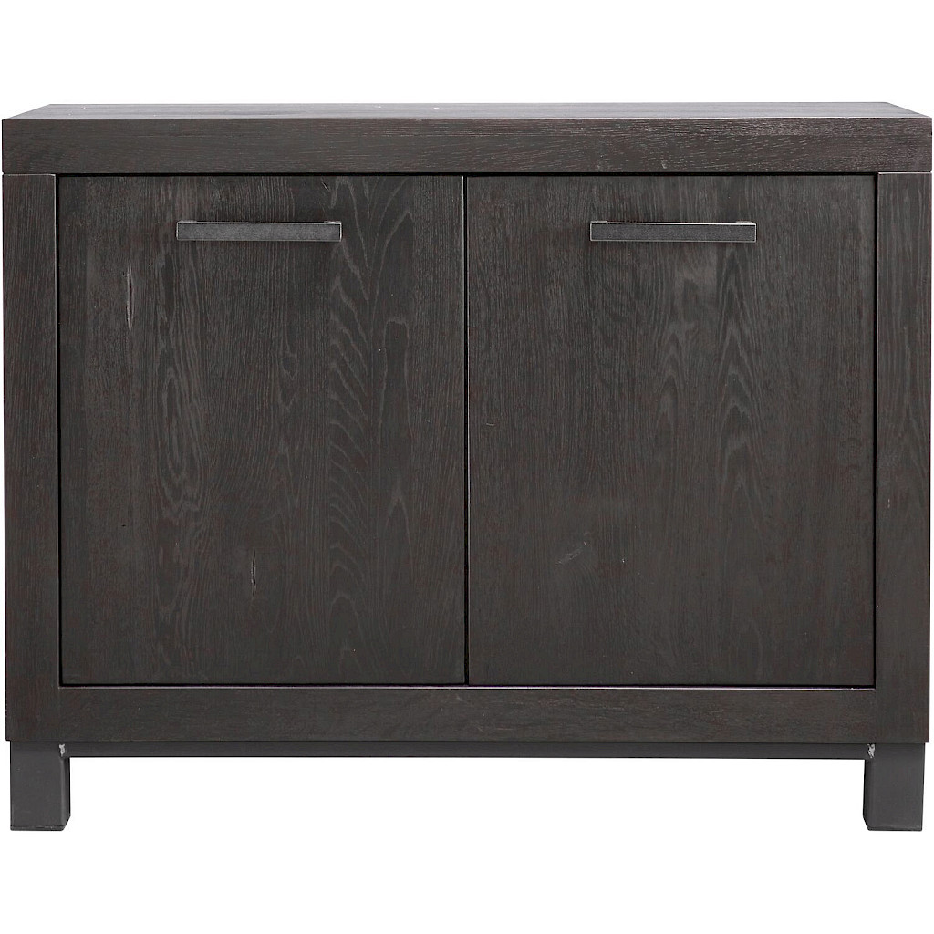 Uitgevoerd met 2 deuren in grotendeels massief robuust eikenhout geborsteld in de kleur 43.5 teer, met zwart metalen handgrepen.