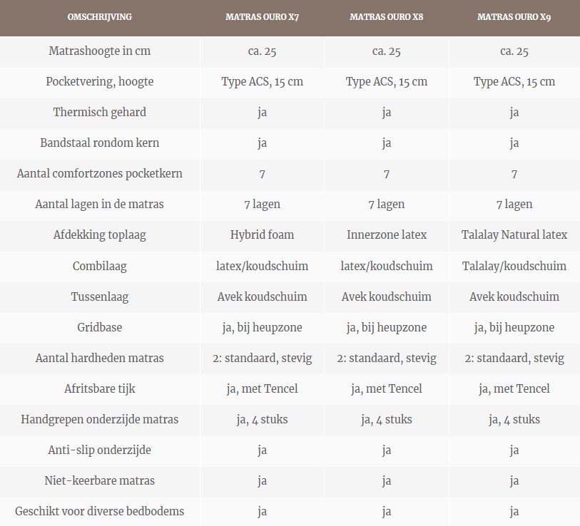 De X7 biedt binnen de exclusieve Ouro serie een iets steviger, maar zeer comfortabele ligging. Drie gezoneerde toplagen met o.a. HybridFoam, latex en OptiFoam® koudschuim op een ACS pocketvering kern van 15 cm hoog, bieden extra comfort in de heup- en schouderzone.