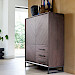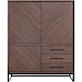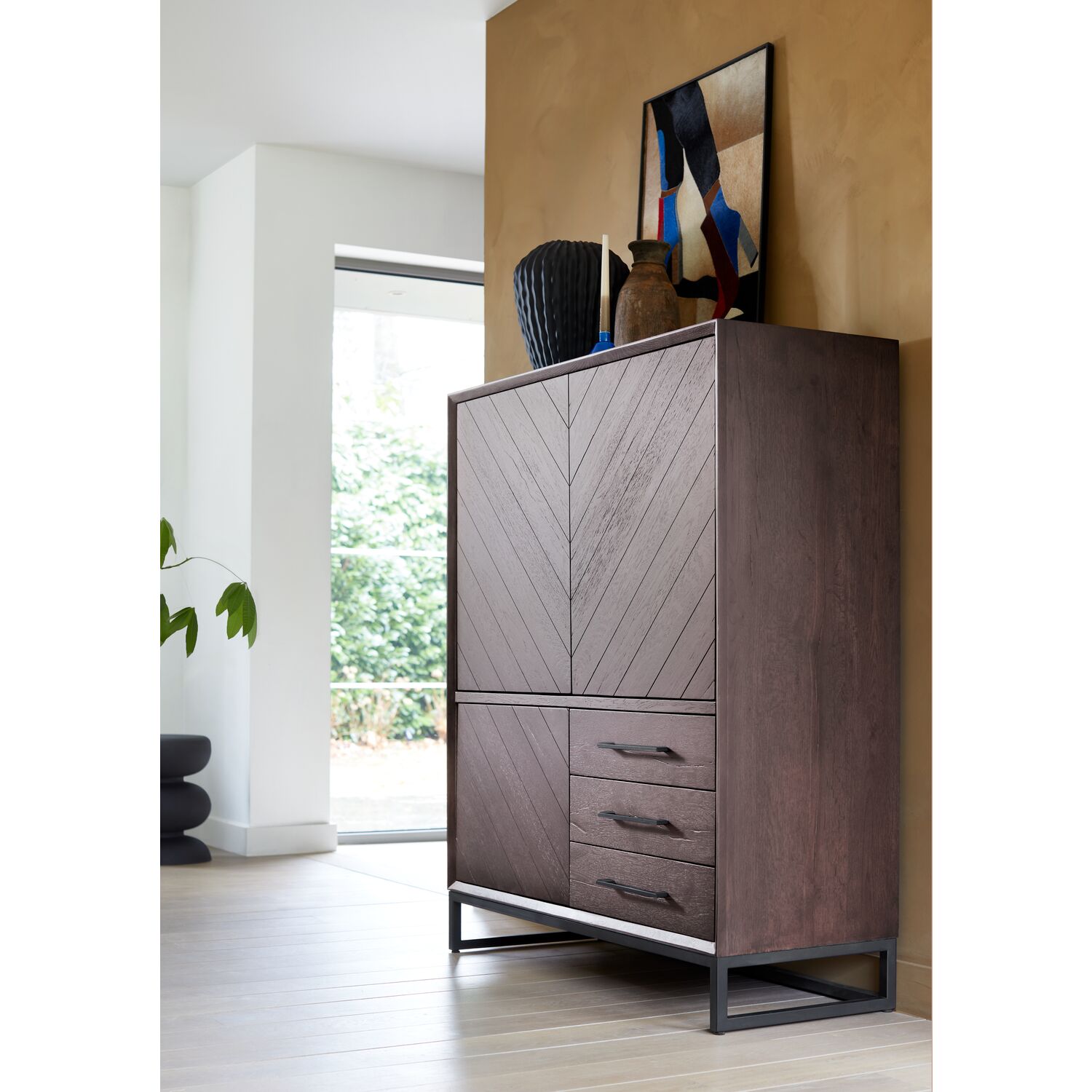 Je kunt kiezen uit verschillende kleuren. Deze opbergkast heeft drie deuren en drie laden en is uitgevoerd met een laklaag in de kleur Coffee.