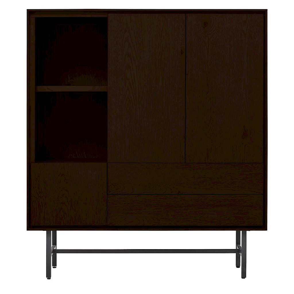 Woonprogramma Belvio is een harmonieuze samenstelling van natuurlijke elegantie en eigentijdse stijl. Deze opbergkast heeft een massief eiken ombouw en de overige delen zijn vervaardigd uit MDF met eiken fineer. De warme en toch moderne uitstraling van het donker eiken in combinatie met het strakke metalen frame geeft je interieur een tijdloze charme.