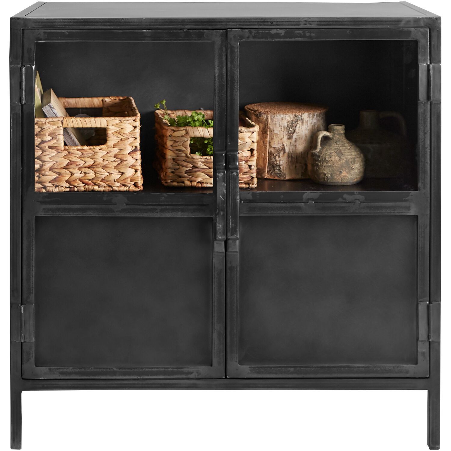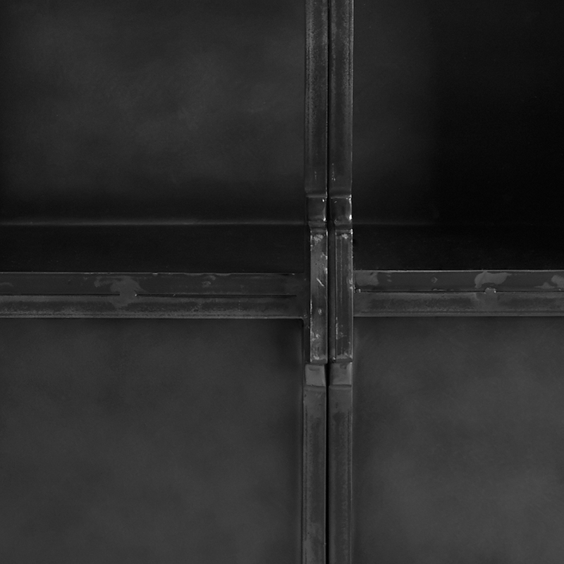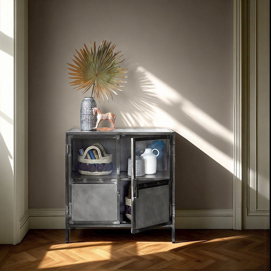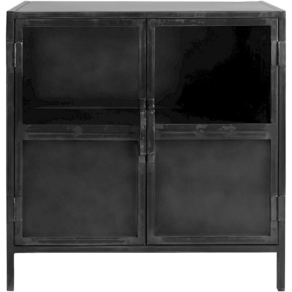 Klein industrieel kastje met metaal en glas. Het kastje kan open gedaan worden d.m.v. van de deuren. De afmetingen zijn 90cm breed, 90cm hoog en 40cm diep. Achter het glas kun je leuke accessoires zetten die in het zicht staan. Het kastje wordt compleet geleverd. Je hoeft het dus enkel nog een leuk plekje te geven.