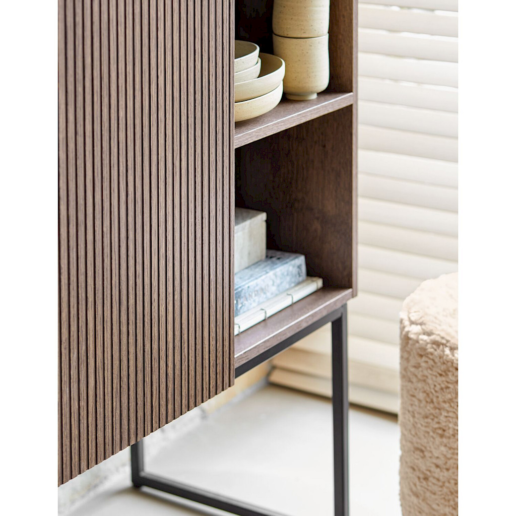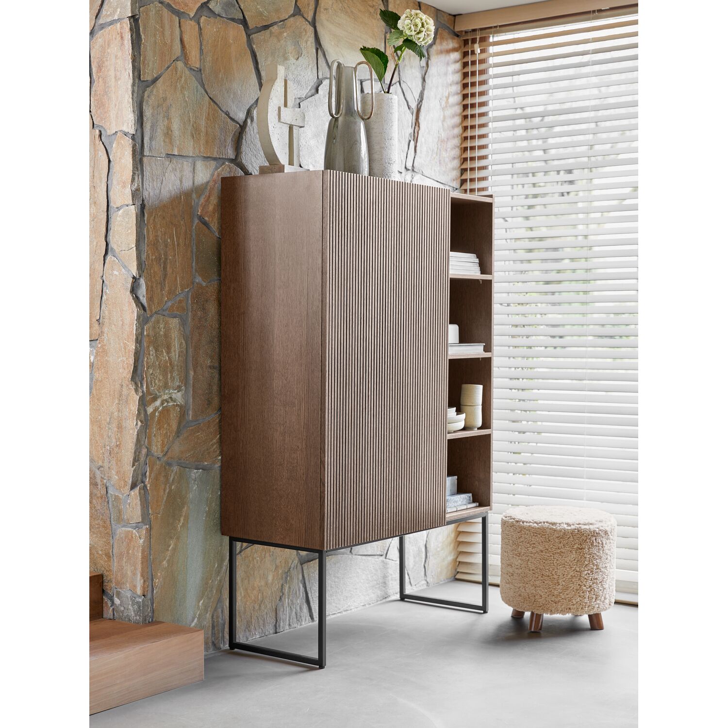 Opbergkast Marandi is onderdeel van een stoer en tijdloos woonprogramma. Deze handige opbergkast is uitgevoerd in bruin eiken fineer en voorzien van 1 grote deur en 4 open vakken. De zwart metalen poten in combinatie met de mooie geribbelde structuur geven model Marandi een licht industriële look. De deur van de kast is voorzien van een push-to-open en soft-close systeem.