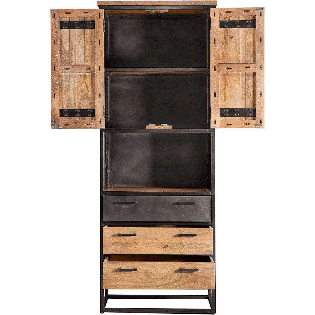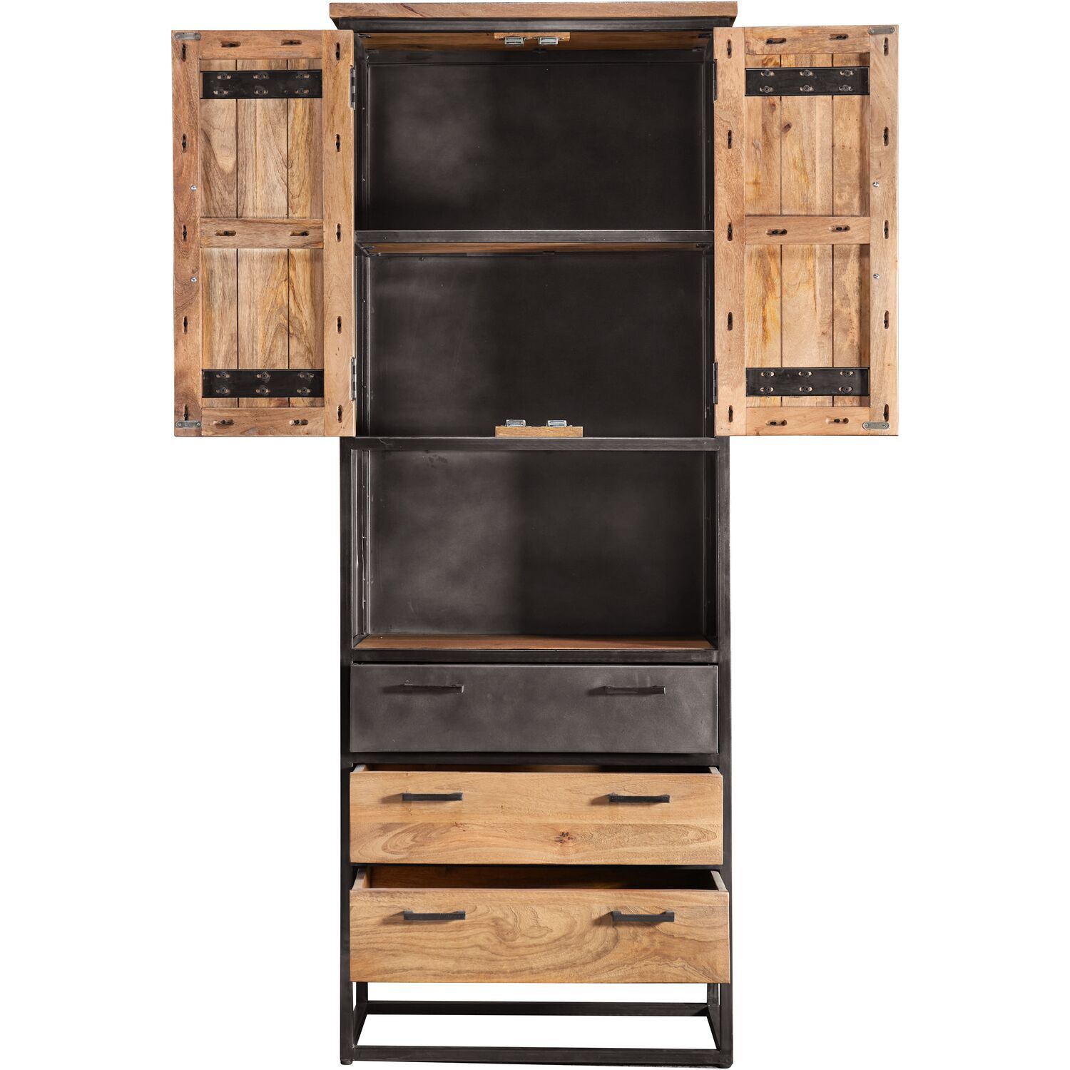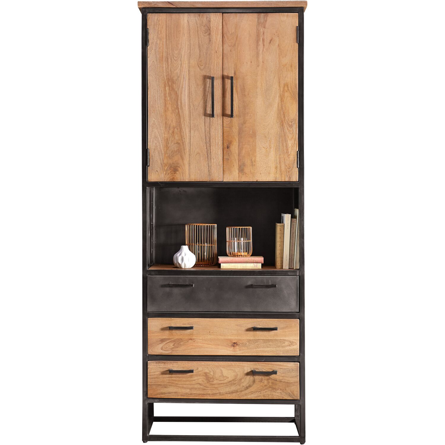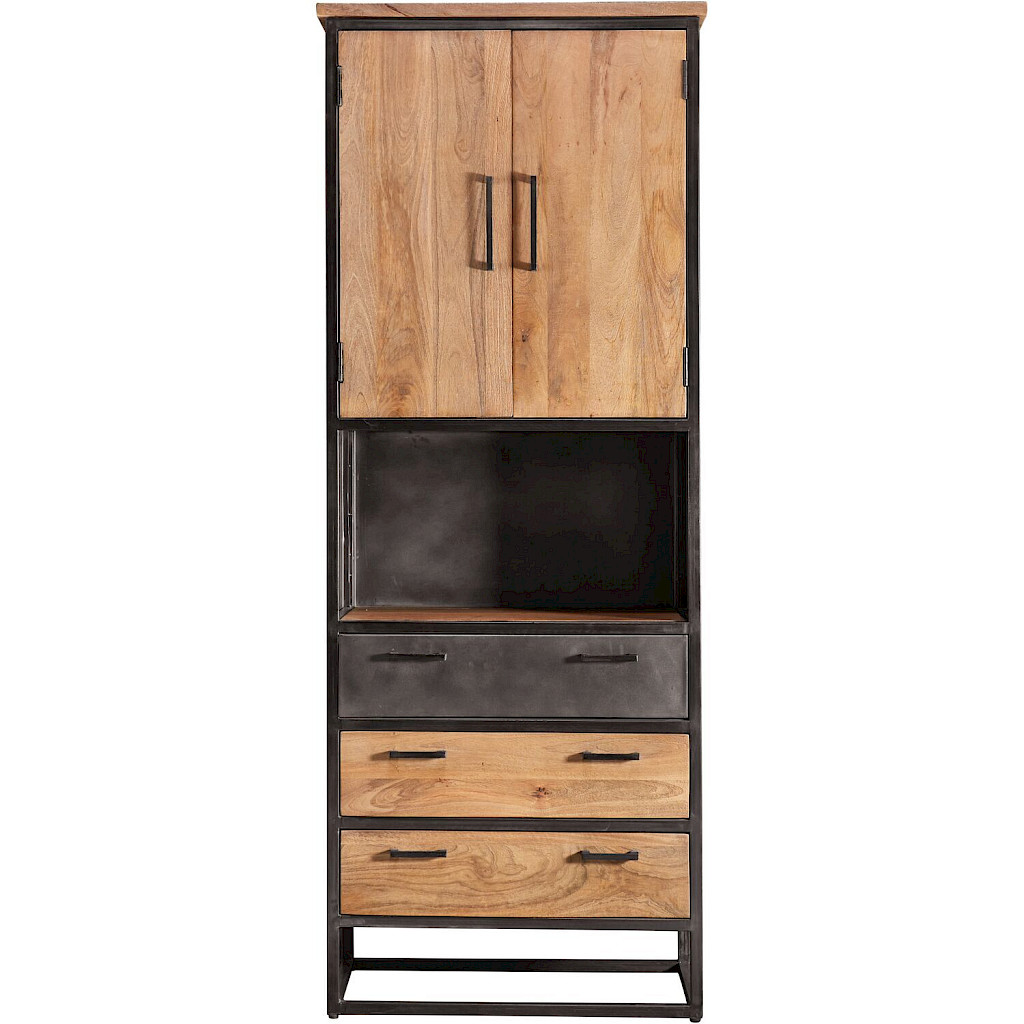 De kast heeft 2 deuren, 3 lades en 1 open vak. Het open vak heeft een hoogte van 39 cm en een breedte van 70 cm. Deze kast is ideaal om je leuke accessoires of boeken een plekje in het zicht te geven, maar ook om spullen ongezien in op te bergen. Met een hoogte van 202 cm en een breedte van 76 cm, biedt deze kast veel opbergruimte. Achter de deuren bevindt zich een vaste legplank.