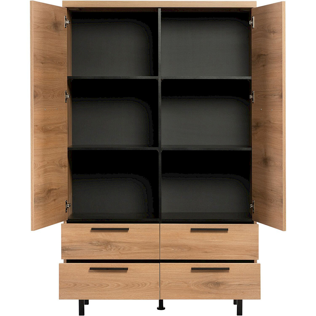 Met een hoogte van 177 cm, breedte van 110 cm en diepte van 42 cm is deze royale kast voorzien van twee deuren en vier laden. Achter de deuren bevinden zich 4 legplanken voor extra opbergruimte. De laden en deuren zijn uitgerust met softclose, zodat ze soepel en geruisloos sluiten. Deze kast biedt veel ruimte voor het opbergen van persoonlijke spullen en accessoires en vormt een stijlvolle blikvanger in je interieur. Het meubel wordt grotendeels gemonteerd geleverd; alleen een kleine montage, zoals het bevestigen van de handgrepen, is nog nodig.