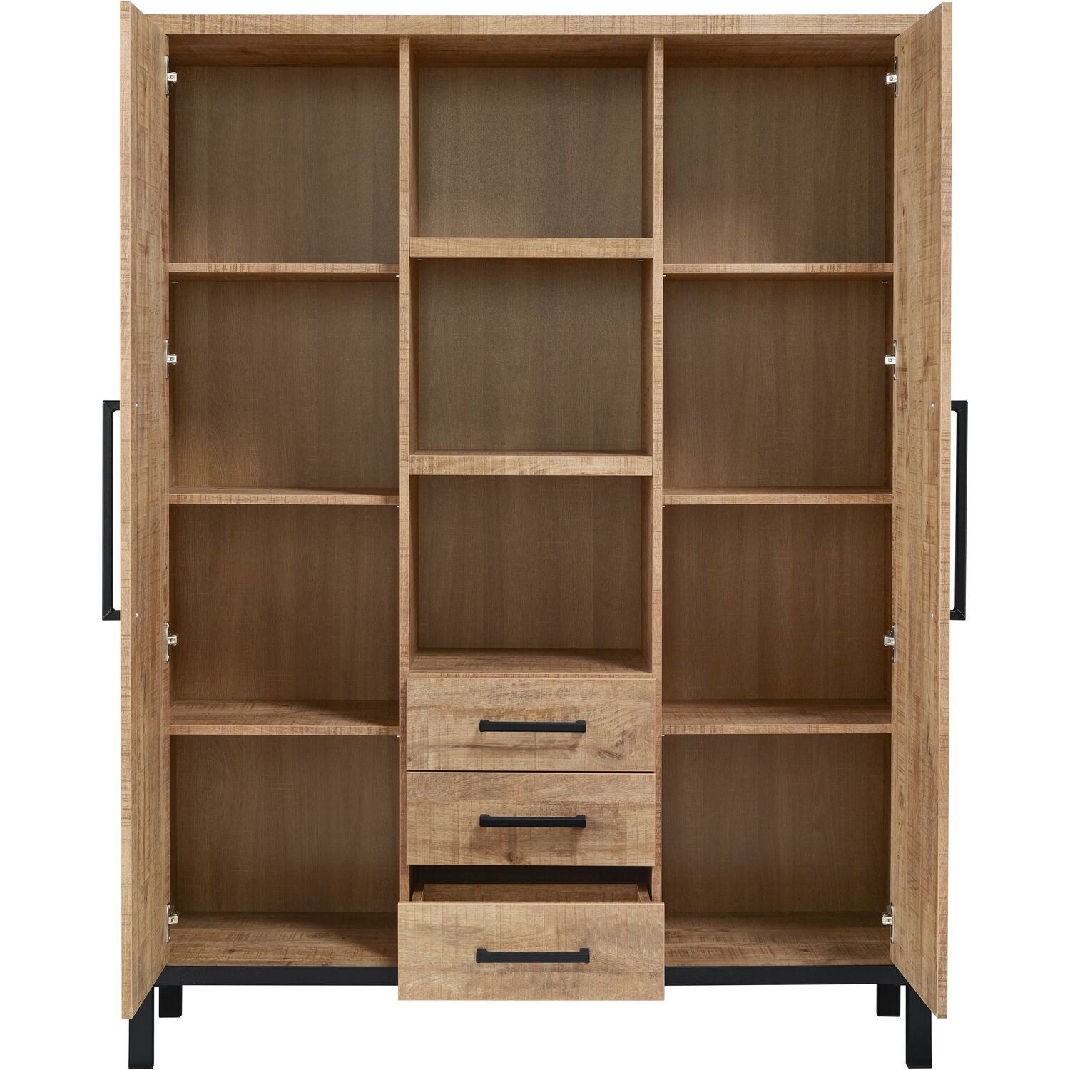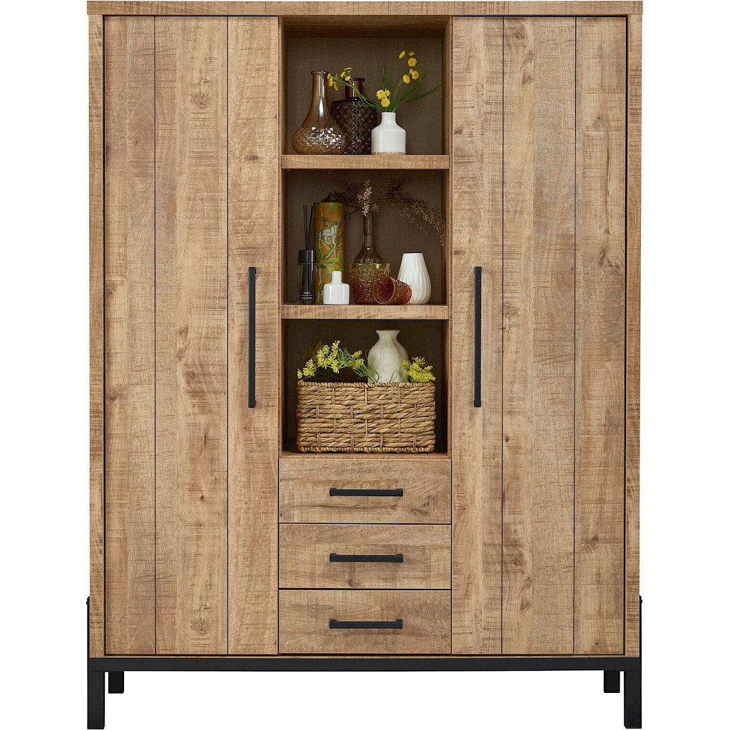 Uitgevoerd in melamine met mango decor in combinatie met zwart metalen frame, met 2 deuren, 3 laden en 3 open vakken.