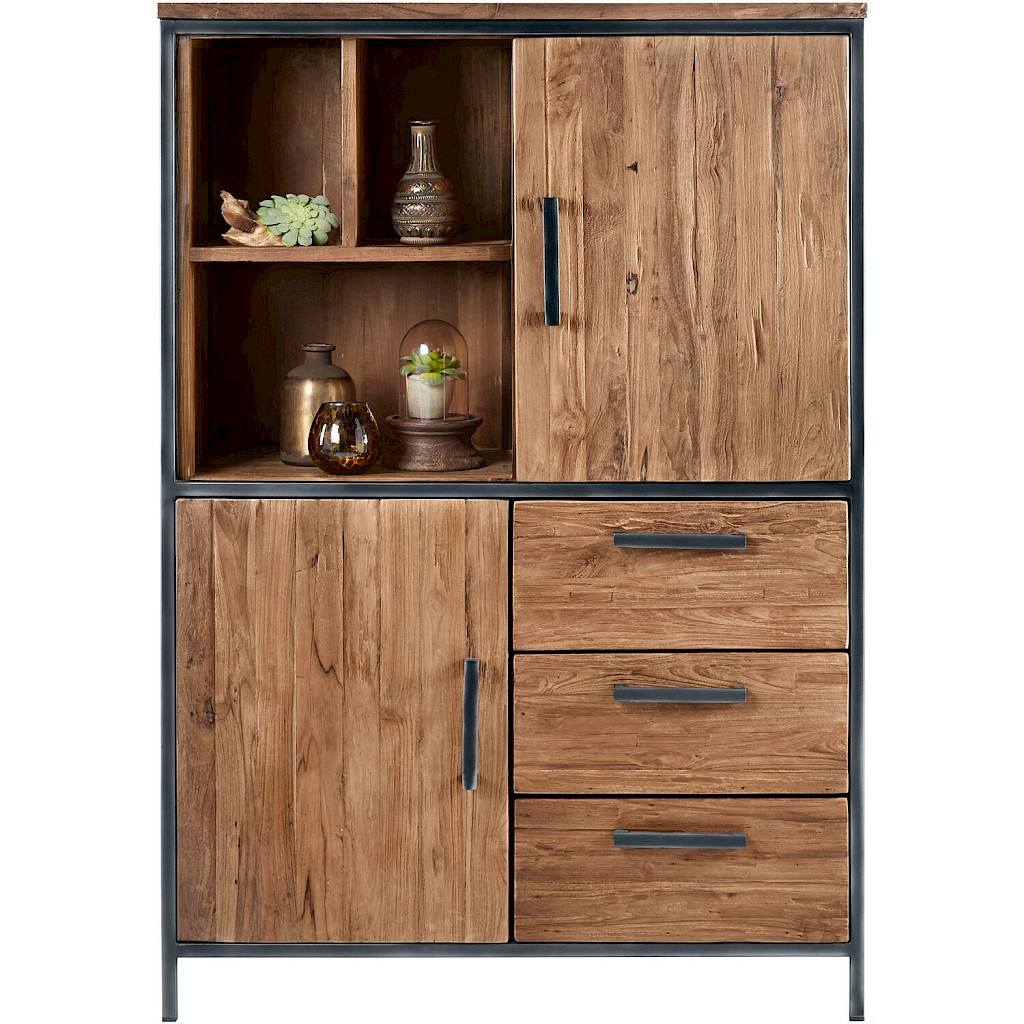 Bergkast Romaro heeft een stoere en robuuste uitstraling en is gemaakt van Mix Rough Teak dat is geborsteld, zodat het een ruw oppervlak heeft. Het hout is afgewerkt met een hoogwaardige matte NC-lak. De combinatie van het grof gelaste stalen frame en het geborsteld teakhout geeft het meubel dit stoere en robuuste karakter. De kast is 98 cm breed en 144 cm hoog en heeft 2 deuren, 3 laden en 3 open vakken, en biedt daardoor flink wat opbergruimte. De maten van de open vakken zijn h29 x b21 x d36 cm en h30 x b40 x d36cm. Achter de deuren zit 1 legplank. Deze kast is dus zowel ideaal om je leuke accessoires of boeken een plekje in het zicht te geven als om spullen in op te bergen.