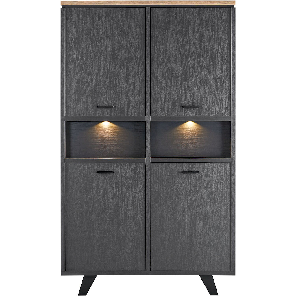 Opbergkast Troia is uitgevoerd in onderhoudsvriendelijk zwart Melamine met een houtstructuur look. De 2 laden zijn voorzien van een push to open systeem en de 4 deuren sluiten door middel van een soft-close systeem. De opbergkast is voorzien van LED-verlichting zodat jij ’s avonds ook die gezellige sfeer in huis kunt creëren. Een leuk detail is dat de metalen poten schuin zijn geplaatst, wat de kast een speelse touch geeft.