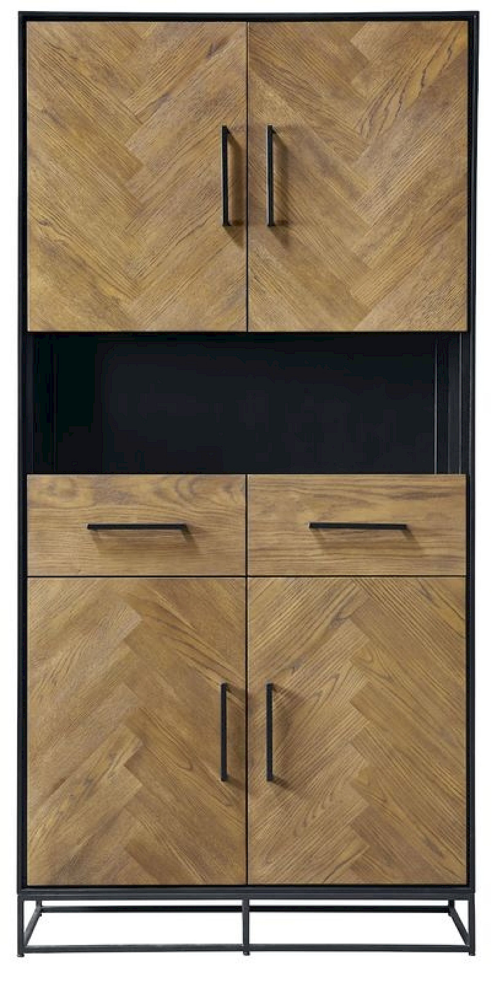 Uitgevoerd in eiken fineer naturel/zwart met visgraat motief. 4 deuren, 2 laden en 1 open vak.