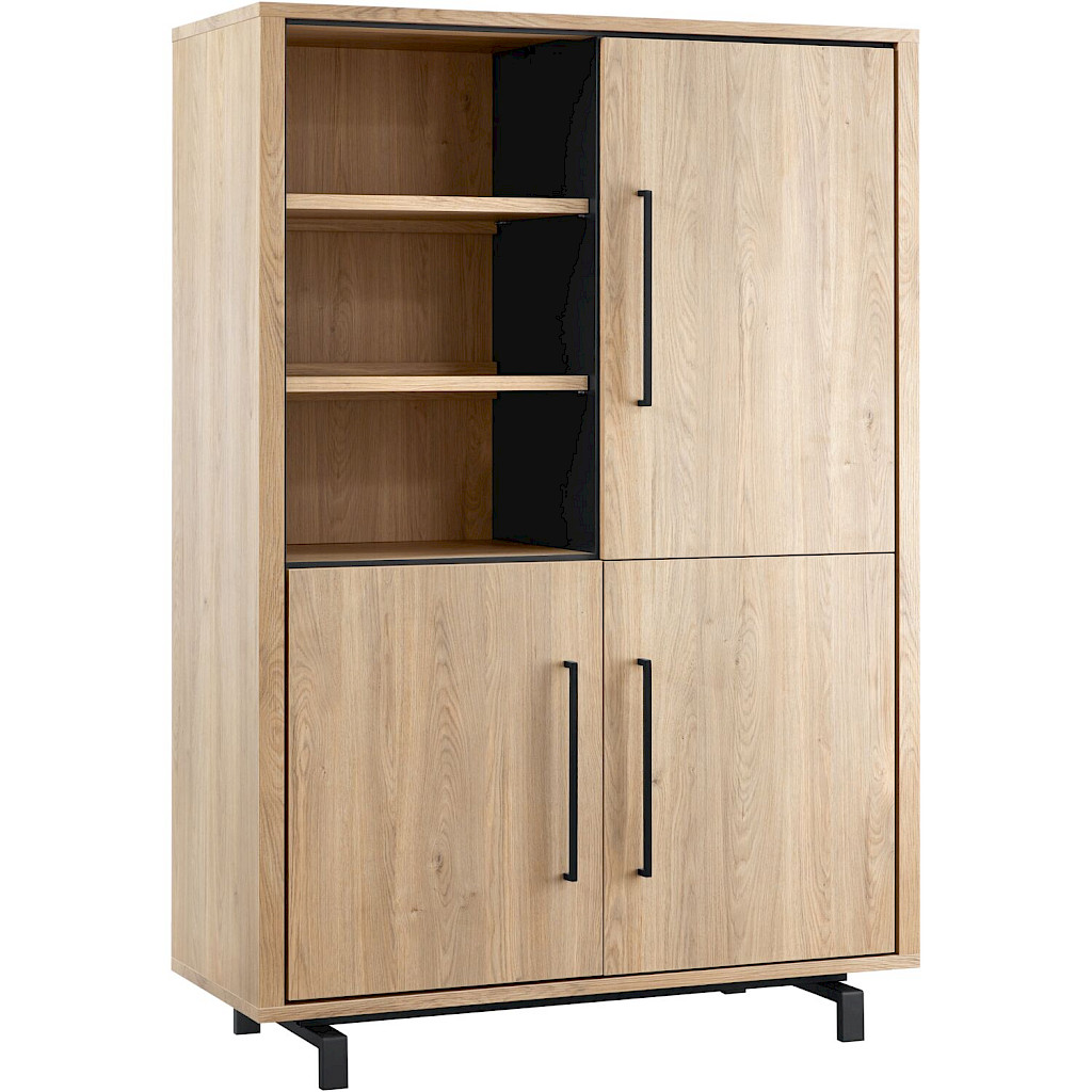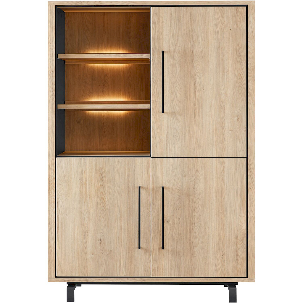 Opbergkast Wesara is 110 cm breed en 160 cm hoog. De deurtjes zijn voorzien van zwarte handgrepen en de open vakken kunnen tegen meerprijs voorzien worden van LED-verlichting. Omdat deze kast onderdeel is van een kastenserie, is hij goed te combineren met andere meubels uit dit woonprogramma. Vraag naar de mogelijkheden in de winkel.