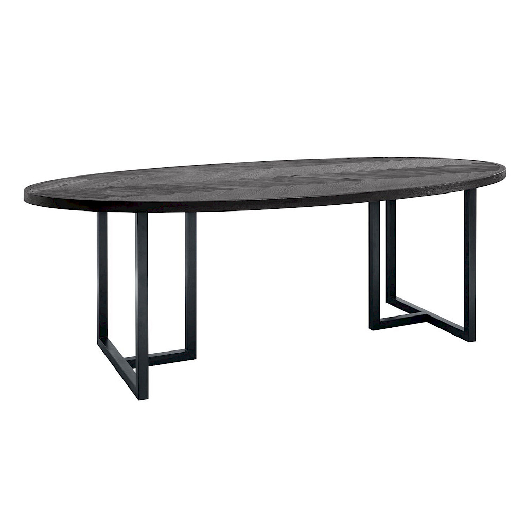 Ovalen eetkamertafel met zwarte metalen T-poten van 4x4 cm uitgevoerd in eiken fineer zwart met visgraat motief. De afmetingen zijn H78xB110xL230cm. Deze stoere eetkamertafel geeft een industriële look binnen je interieur. De hoogte vanaf de grond tot de onderkant is ongeveer 73cm. De eetkamertafel is ook beschikbaar in een kleinere maat (200x100cm) of met een rechthoekig blad (160cm, 190cm of 220cm). Het blad kan daarnaast ook in eiken fineer naturel geleverd worden. Je dient enkel de poten nog eventjes te monteren.