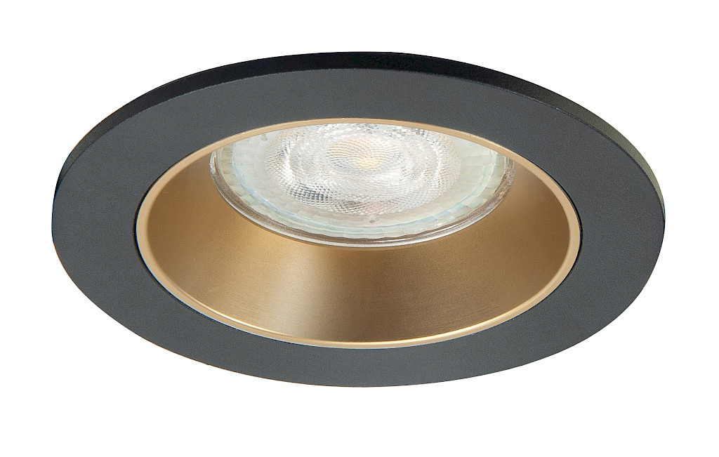 Plafondlamp Downlights zwart + goud met 1 lichtpunt en Ø 9,4 cm. Deze lamp wordt geleverd zonder lichtbron(nen). Als lichtbron kan zowel een gloei- als LED lamp worden gebruikt. Dimbaar via externe dimmer.