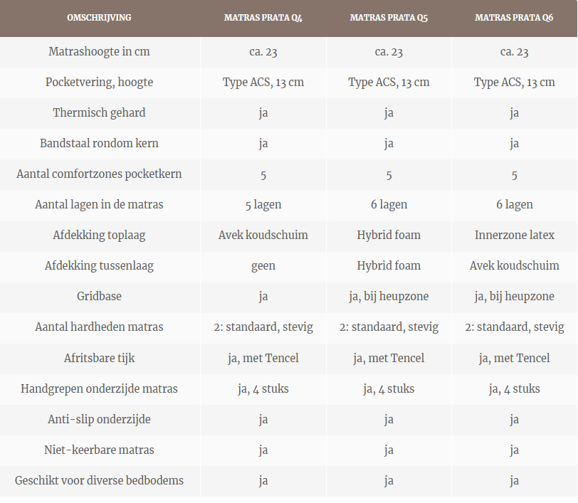 De Prata Q4 heeft een royale afdeklaag van 5 cm dik OptiFoam® koudschuim aan de bovenzijde. De ACS pocketkern van 13 cm dik vormt de basis van de matras, en zorgt voor goede ondersteuning. Het is een fijn matras voor als je van een wat stevigere ligging houdt.