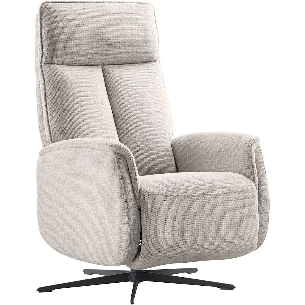 Deze draai- en relaxfauteuil is bekleed met een meerkleurige weefstof in een verfijnde lichtgrijze tint. De subtiele, zachte structuur en de elegante kleur zorgen voor een tijdloze uitstraling die in ieder interieur past. Sierstiksels in de rugleuning, de armleuningen en de zwarte metalen 5-teens poot creëren samen een elegante belijning, waardoor de fauteuil je woonkamer compleet maakt.