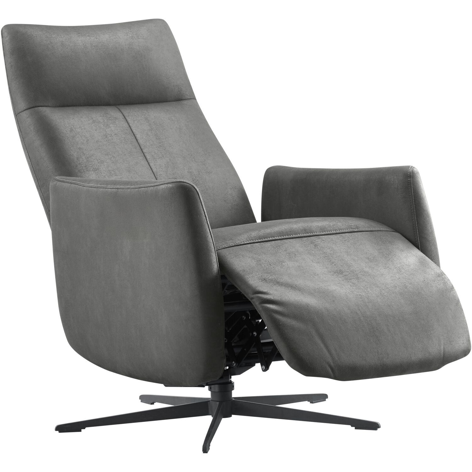 Deze draai- en relaxfauteuil is uitgevoerd met een microleder in de kleur antraciet. Microleder is een duurzame, samengestelde bekleding van stof en leer die de luxe uitstraling van echt leer combineert met de voordelen van eenvoudig onderhoud. Het horizontale sierstiksel in de rugleuning geeft de fauteuil een moderne uitstraling, terwijl de elegante kleur zich gemakkelijk laat combineren met elke interieurstijl. De zwarte metalen 5-teens poot maakt de look compleet.