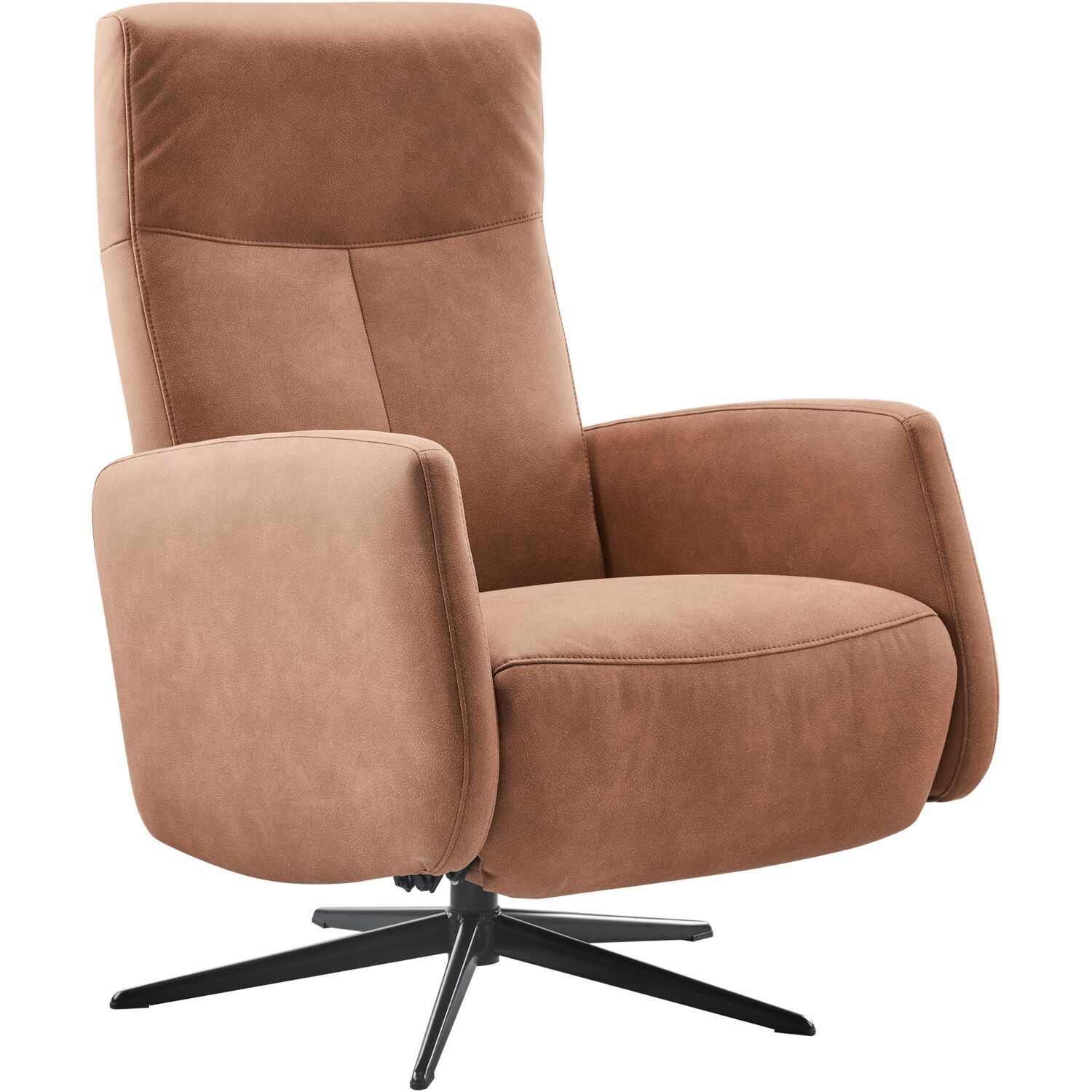 Relaxfauteuil Perfini is bekleed met een bruine microvezelstof, deze heeft een licht gemeleerd patroon en voelt zacht en comfortabel aan. De stof is onderhoudsvriendelijk. Sierstiksels in de rugleuning zorgen samen met de stijlvolle armleuningen voor een elegante belijning.