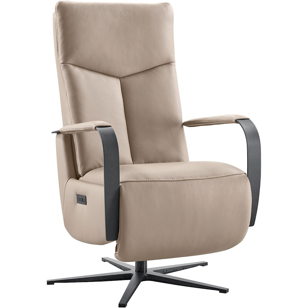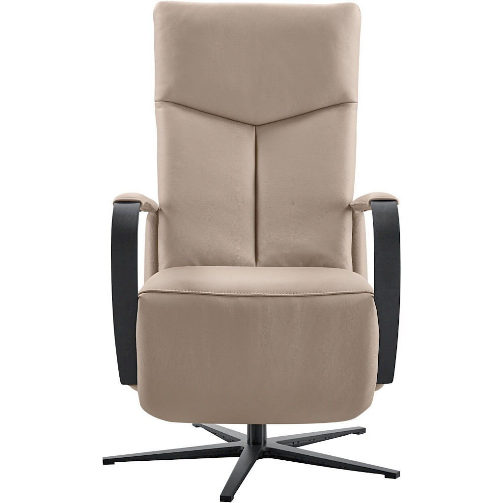 De relaxfauteuil Seduto heeft een moderne en stijlvolle uitstraling. Deze uitvoering is bekleed met leder in een natuurlijke beigekleur met een warme uitstraling. Het leder voelt soepel en comfortabel aan en heeft een subtiele nerf voor een luxe, rustige look. De kleur laat zich makkelijk combineren met verschillende woonstijlen. Het Y-vormige stiksel in de rug en de metalen armleuningen met lederen sleeve zorgen voor een eigentijdse uitstraling. De zwarte metalen 5-teens voet geeft de fauteuil een moderne basis.