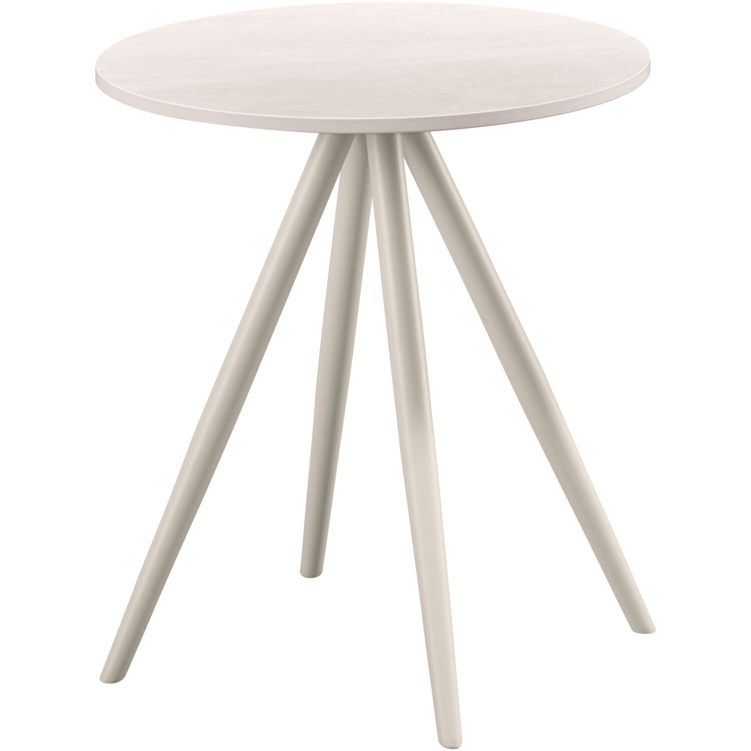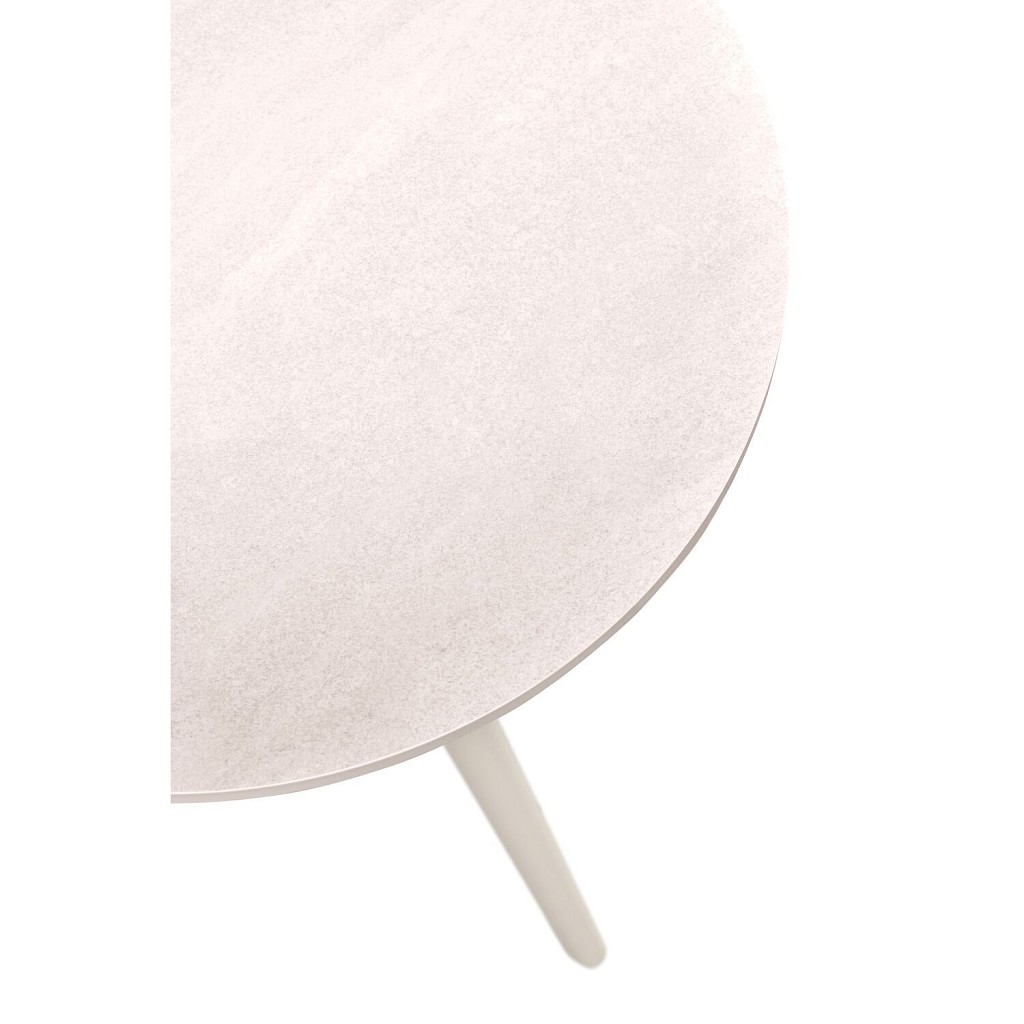 Uitgevoerd met een keramieken blad (12 mm dik) in kleur white grey en een taps rond metalen kruispoot in kleur pearl white.