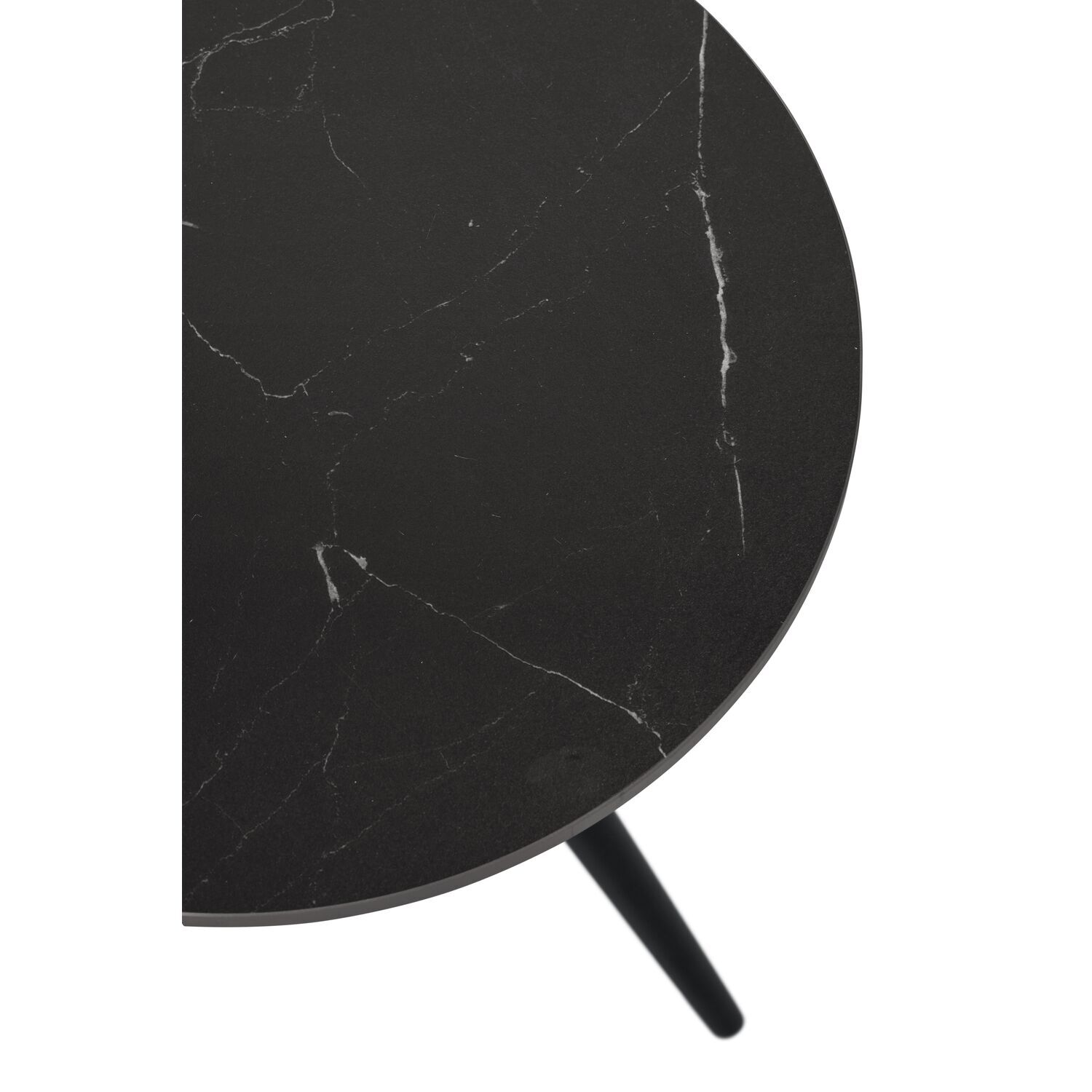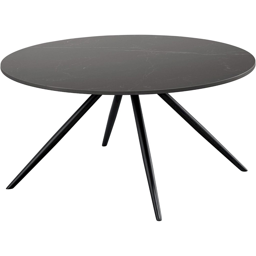 Deze salontafel is uitgevoerd met een keramisch blad in een matzwarte kleur met een marmerlook. Het ronde blad geeft de tafel een speelse uitstraling. Het blad is slijtvast en geschikt voor dagelijks gebruik, waardoor het lang mooi blijft. Het metalen onderstel met slanke poten geeft de tafel een luchtig karakter en zorgt voor een stevige basis.