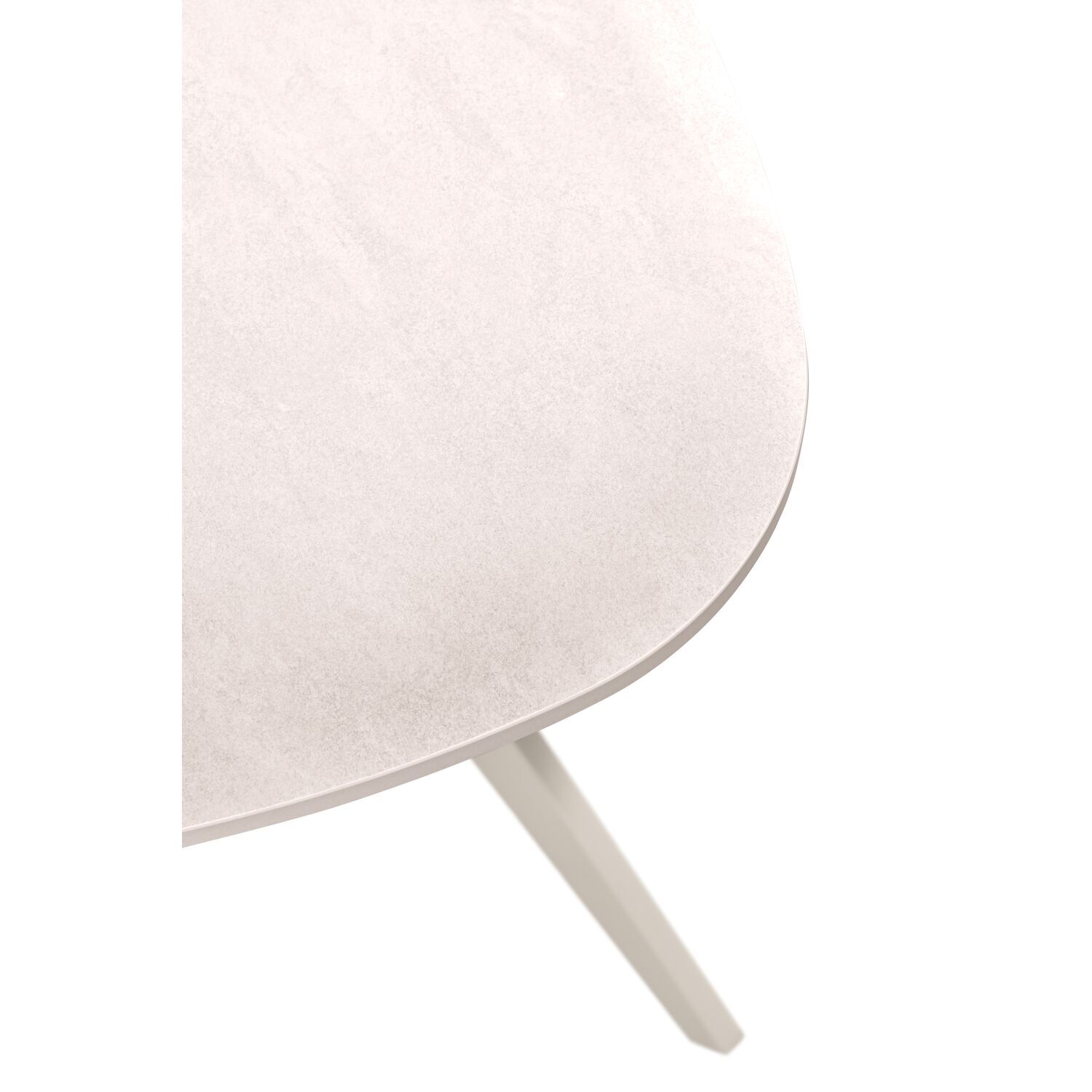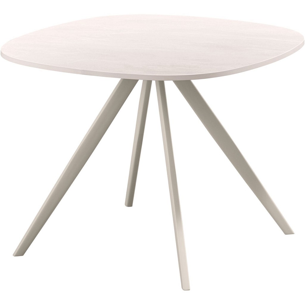 Uitgevoerd met een keramieken blad (12 mm dik) in kleur white grey en een taps vierkant metalen kruispoot in kleur pearl white.