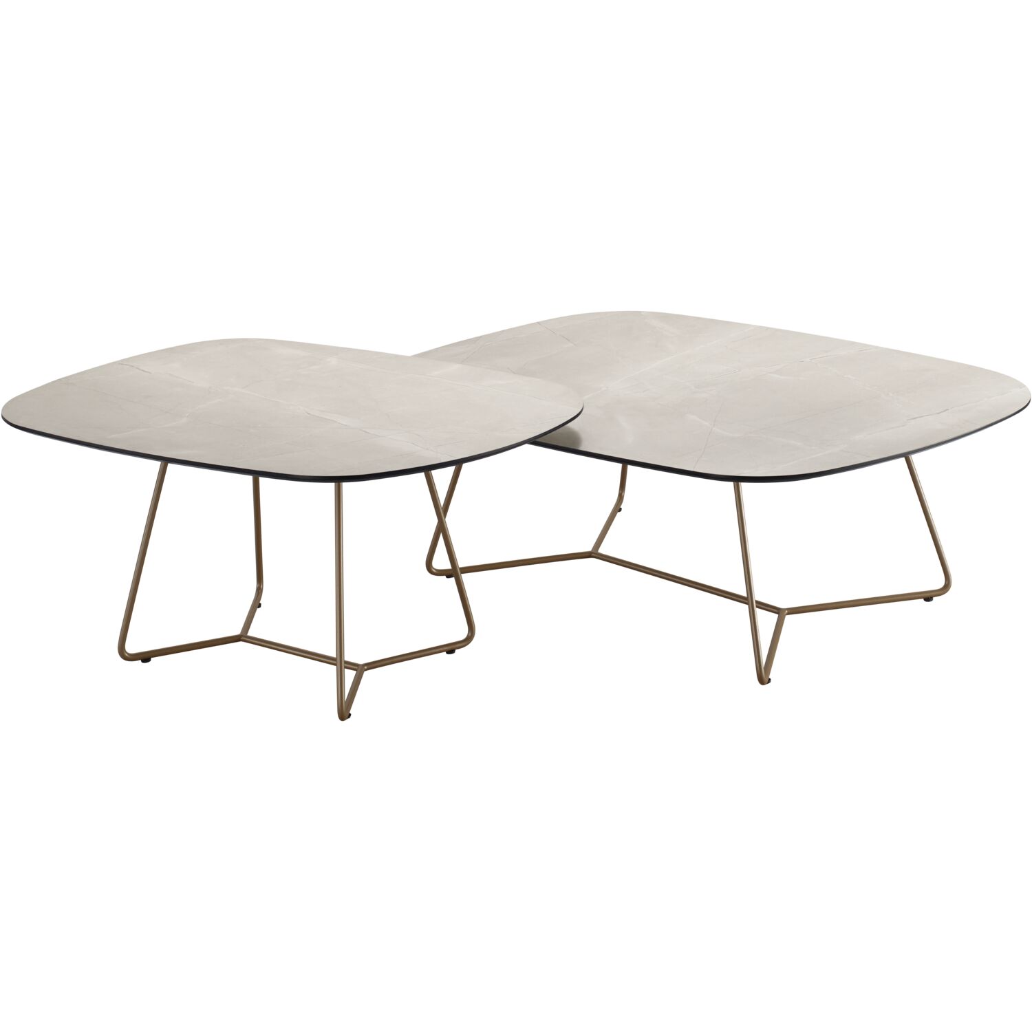Met een organisch bovenblad in onderhoudsvriendelijk HPL. Het blad, met zijn grijze marmerstructuur heeft een afgeschuinde bladrand. Deze uitvoering van 75x54 cm, heeft een bronskleurig draadframe, wat door zijn sierlijke ranke buis, mooi past onder de organische bladvorm.
