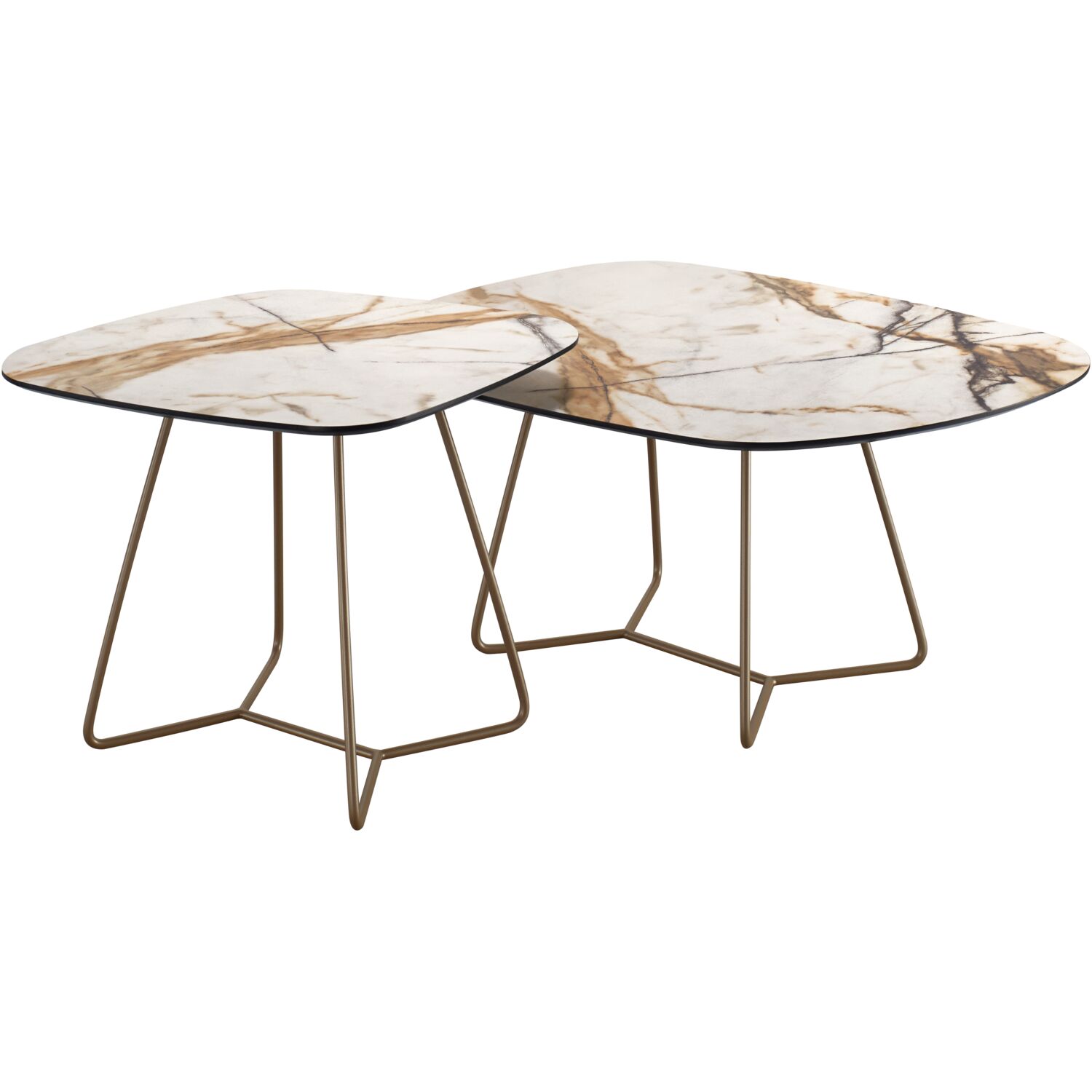 Stel je Marby salontafelset zelf samen. Zo kun je naast dit formaat van 75x54xH36 cm ook nog kiezen uit de formaten; 54x48xH41 cm en 90x69xH31 cm. Daarnaast is er keuze uit vele HPL bladkleuren en structuren. Het Anodic bronskleurige metalen frame is zonder meerprijs, maar wil je liever een frame in de kleur Champagne, zwart, of een bepaalde RAL kleur, dan kan dat tegen meerprijs. Vraag de verkoopadviseur in de winkel naar alle mogelijkheden.