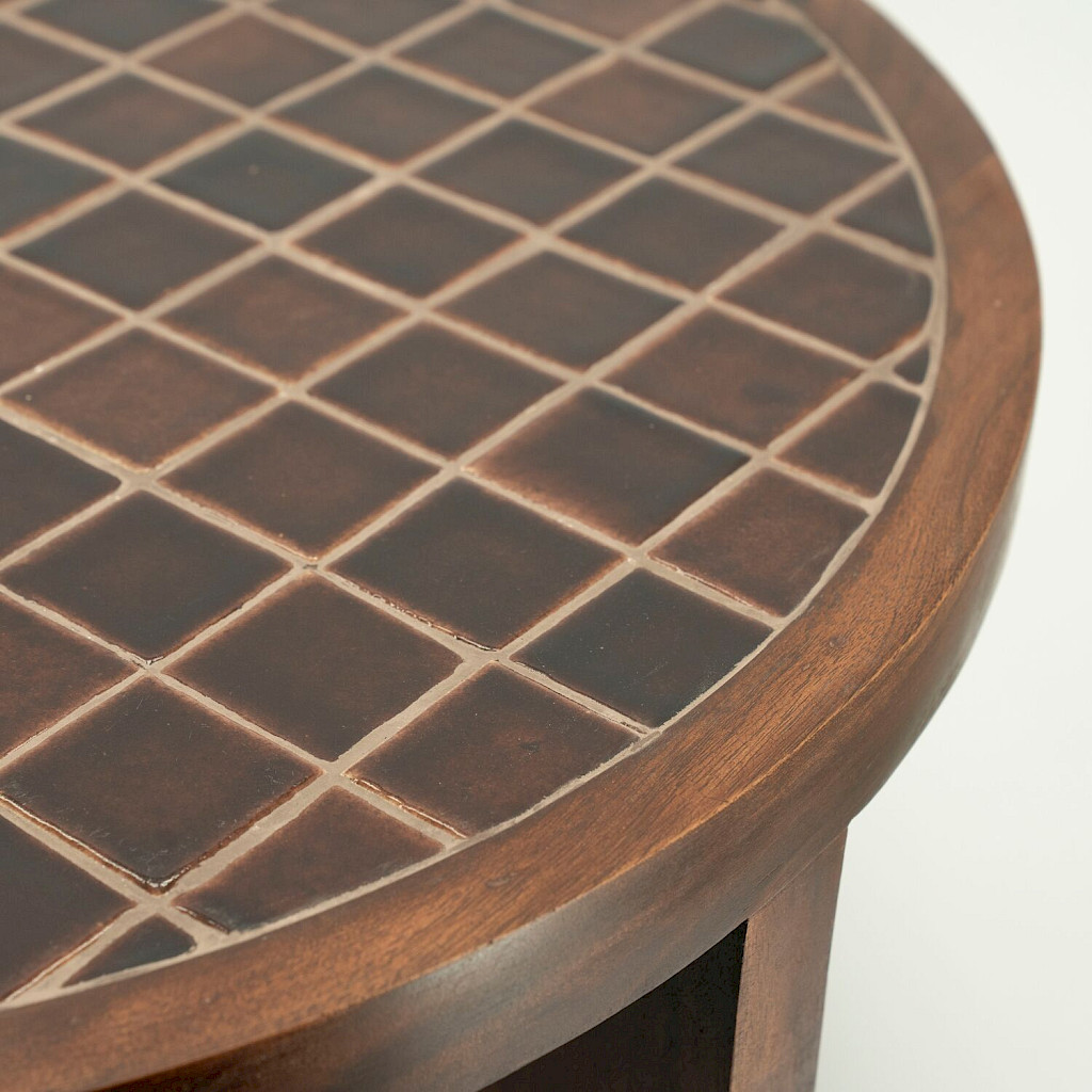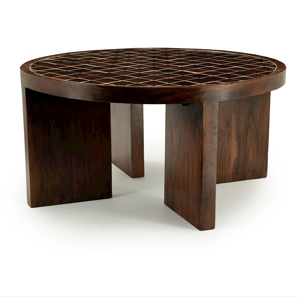 Uitgevoerd in bruin mangohout met een inleg van keramiek