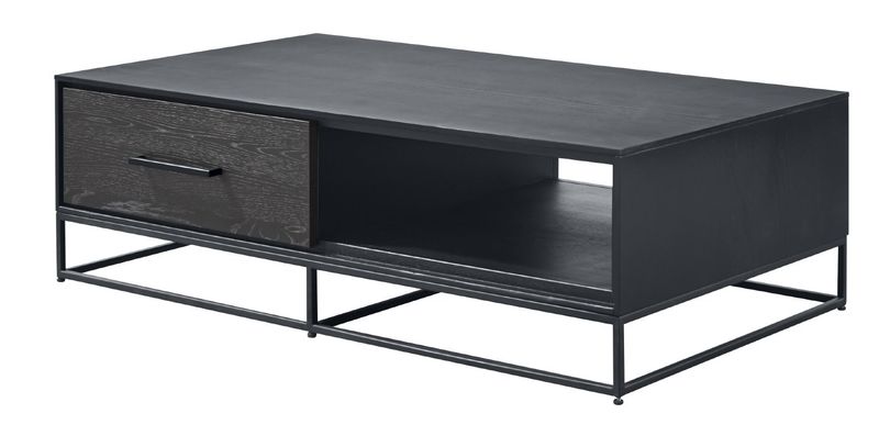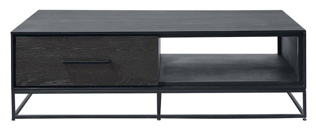 Zwarte industriële salontafel uitgevoerd in eiken fineer van 37cm hoog, 70cm breed en 124cm lang. Door de 2 laden, met soft-close systeem, heb je voldoende ruimte om spullen niet-zichtbaar op te bergen. Daarnaast kun je het open vak gebruiken voor zichtbare spullen zoals bijvoorbeeld een afstandsbediening of tijdschrift. Het is ook beschikbaar in een kleinere maat, zonder open vak of in de kleur naturel. De salontafel wordt gemonteerd geleverd.