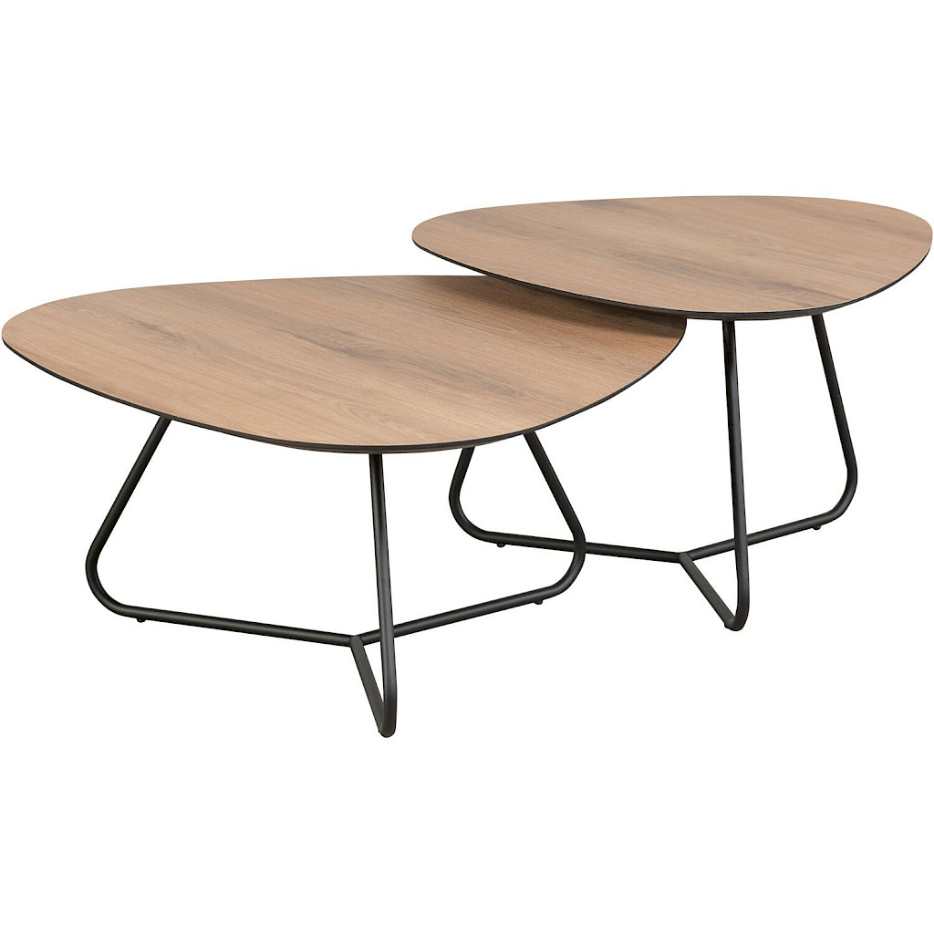 De bladen zijn driehoekig van vorm, wat de set een speelse en eigentijdse uitstraling geeft. Het zwart metalen onderstel vormt een mooi contrast met het warme blad. De twee tafels zijn los van elkaar te plaatsen, waardoor je ze flexibel kunt gebruiken: samen als salontafelset of apart als bijzettafel naast de bank of fauteuil. De set wordt ongemonteerd geleverd, maar met de bijgesloten handleiding zet je de tafels eenvoudig in elkaar.