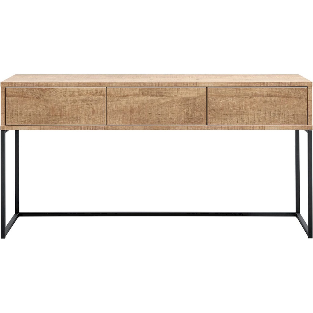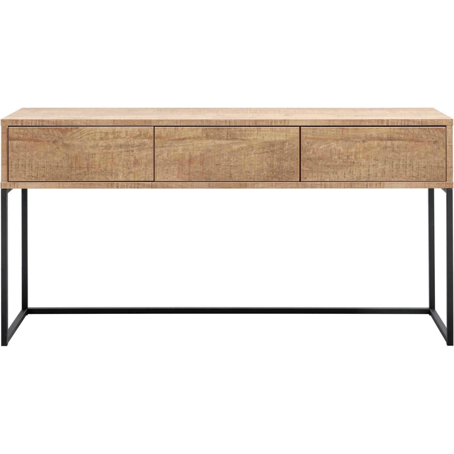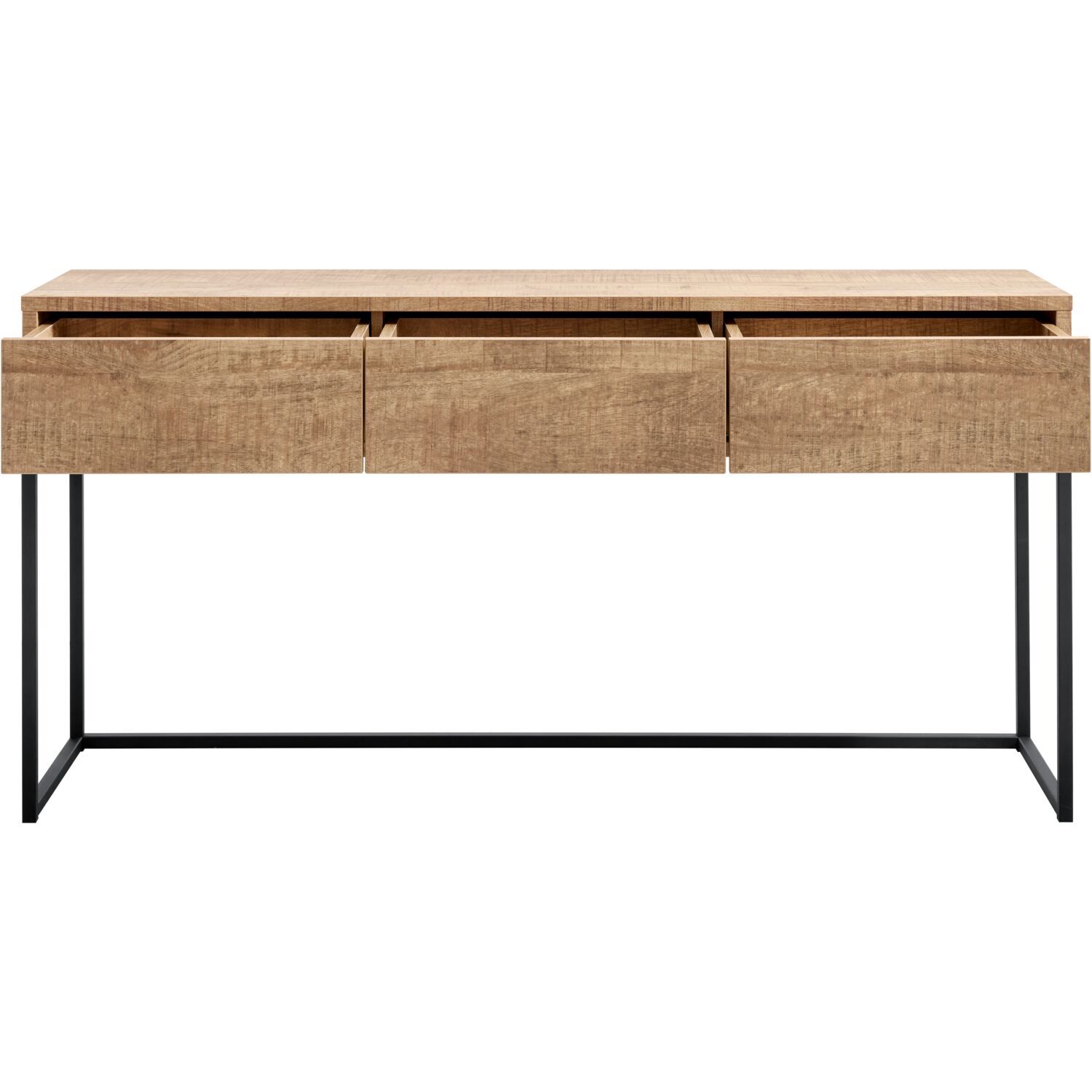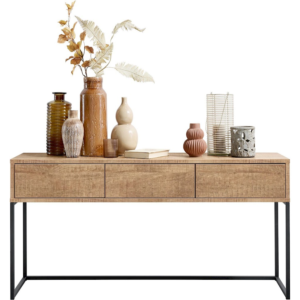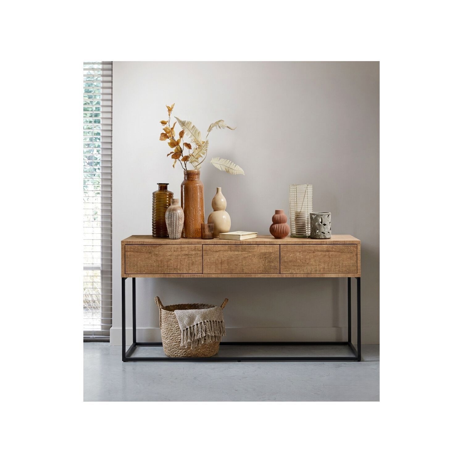 Deze sidetable is uitgevoerd in een warme houtkleur met een levendige mix van lichte, goudachtige en iets donkerdere tinten. Het slanke metalen frame in zwart zorgt voor een krachtig contrast. Dankzij het formaat is de tafel ideaal voor gebruik in de hal, als wandtafel tegen de muur of achter de bank. De laden zijn voorzien van een push to open systeem en softclose, waardoor deze eenvoudig openen en sluiten.