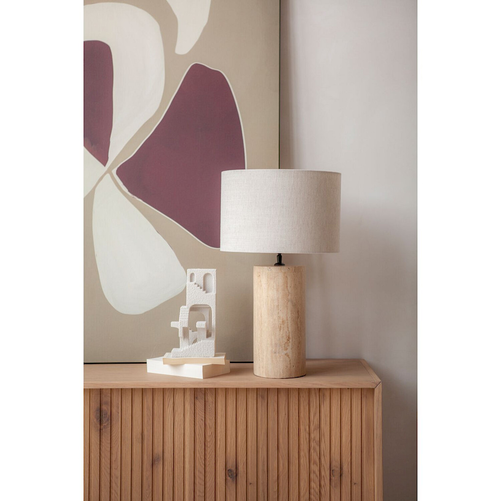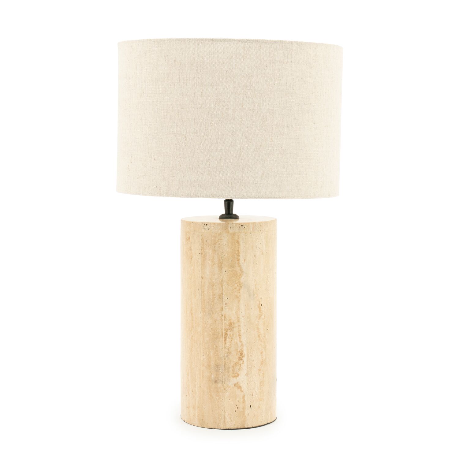 Uitgevoerd in natuurlijk travetin en linnen. Exclusief E27 lichtbron.
