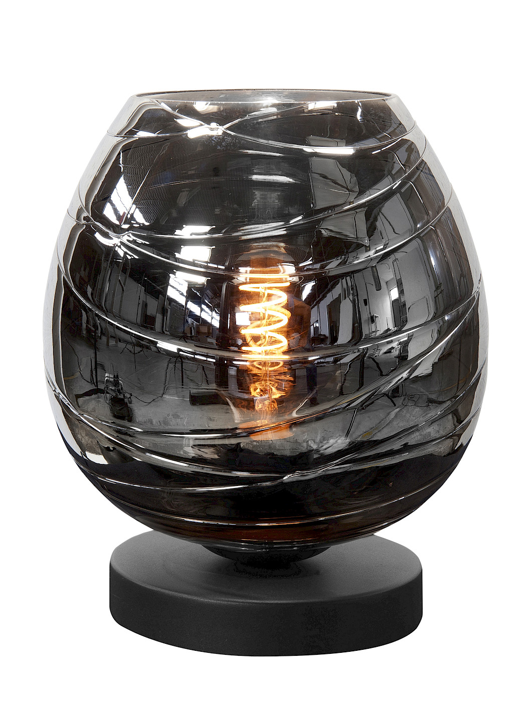 Tafellamp Fantasy zwart + smoke glas met 1 lichtpunt en Ø 21 cm. Deze lamp wordt geleverd zonder lichtbron(nen). Als lichtbron kan zowel een gloei- als LED lamp worden gebruikt. Dimbaar via externe dimmer.