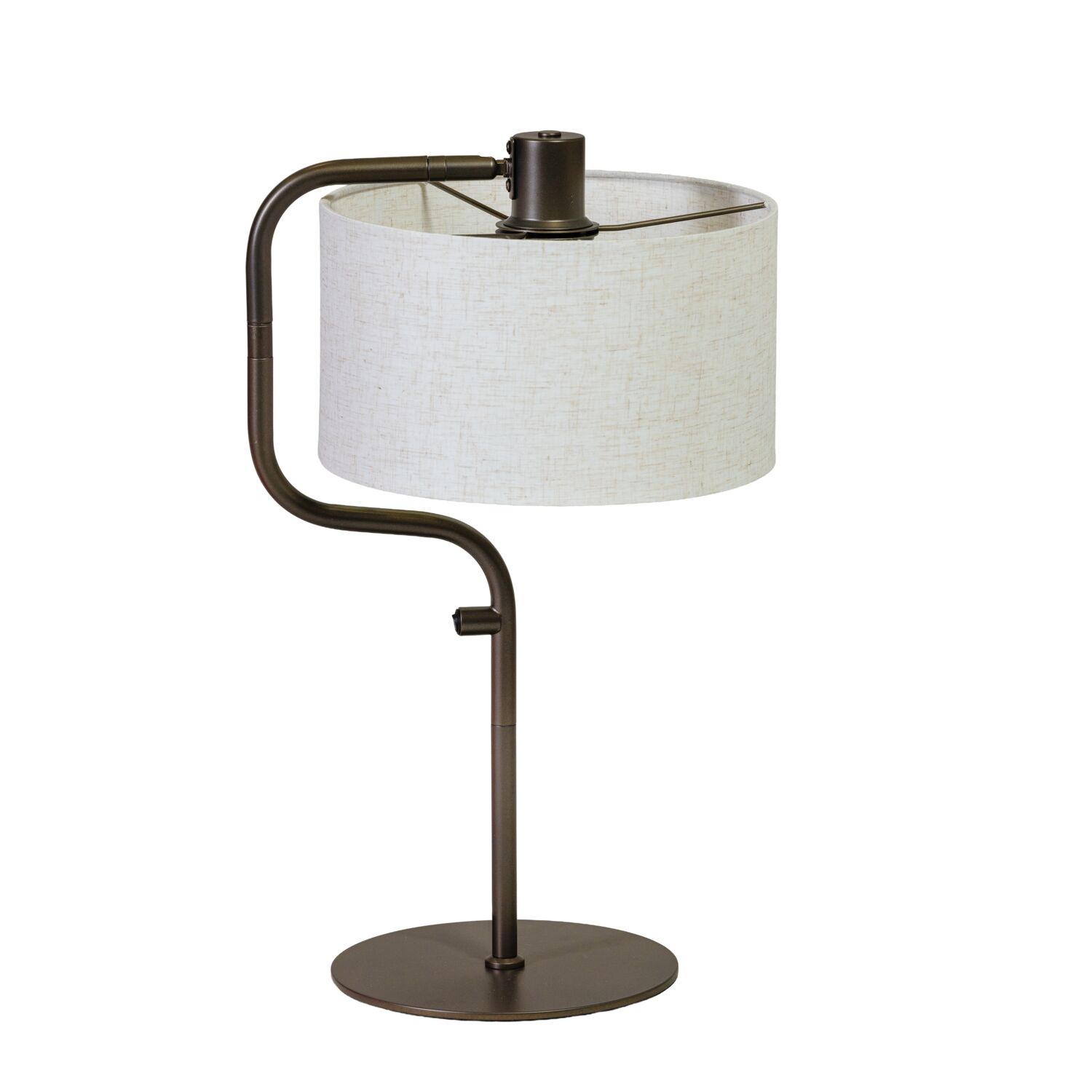 Uitgevoerd in een metalen voet in de kleur anodic brown met zandkleurige stoffen kap 28 cm. Exclusief lichtbron E27.