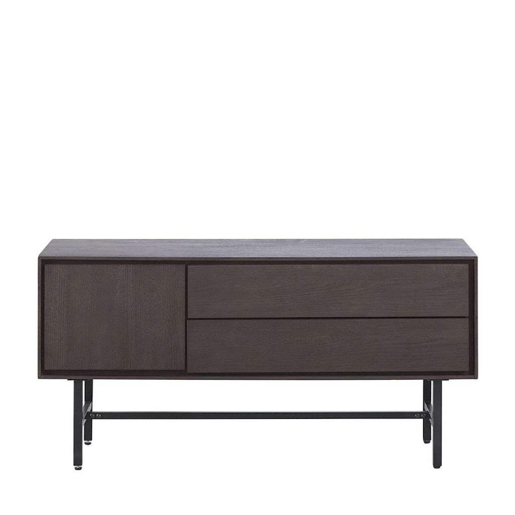Uitgevoerd in dark oak veneer met een metalen frame met 1 deur, 1 lade en 1 klep. OP=OP