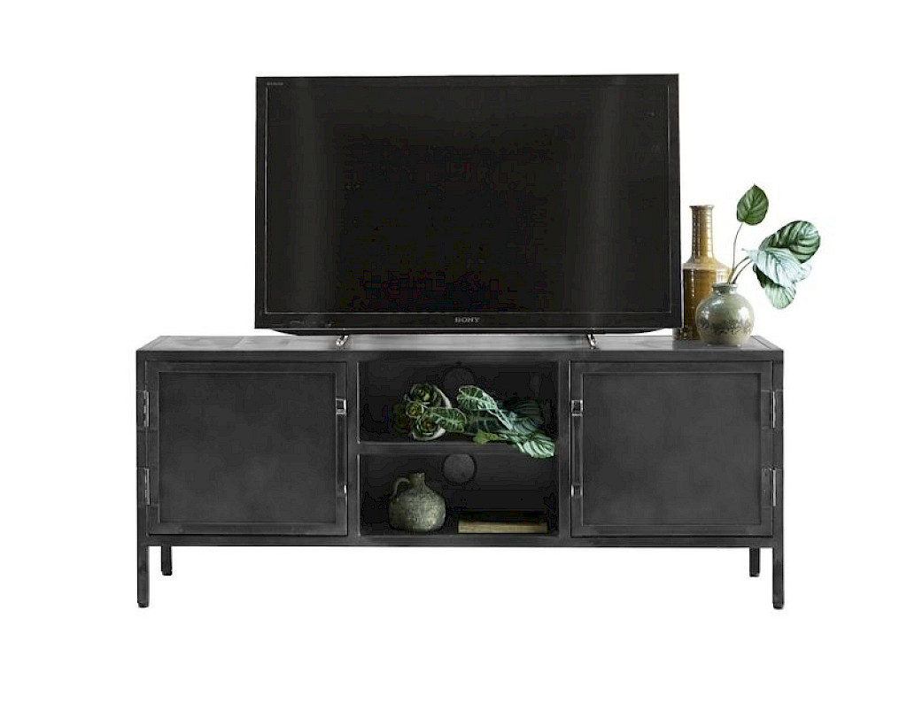 Uitgevoerd in metaal, afgewerkt met Patina verf (antique finish), met 2 deuren en 2 open vakken. Meubel heeft kleine beschadiging (2cm) bovenop achteraan. (Als je de TV óp het meubel zet zie je de beschadiging niet)