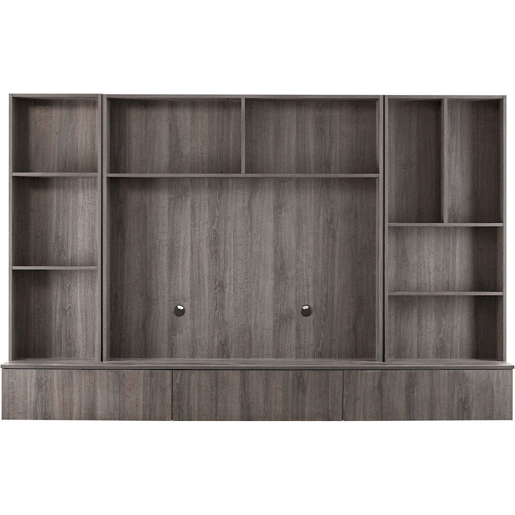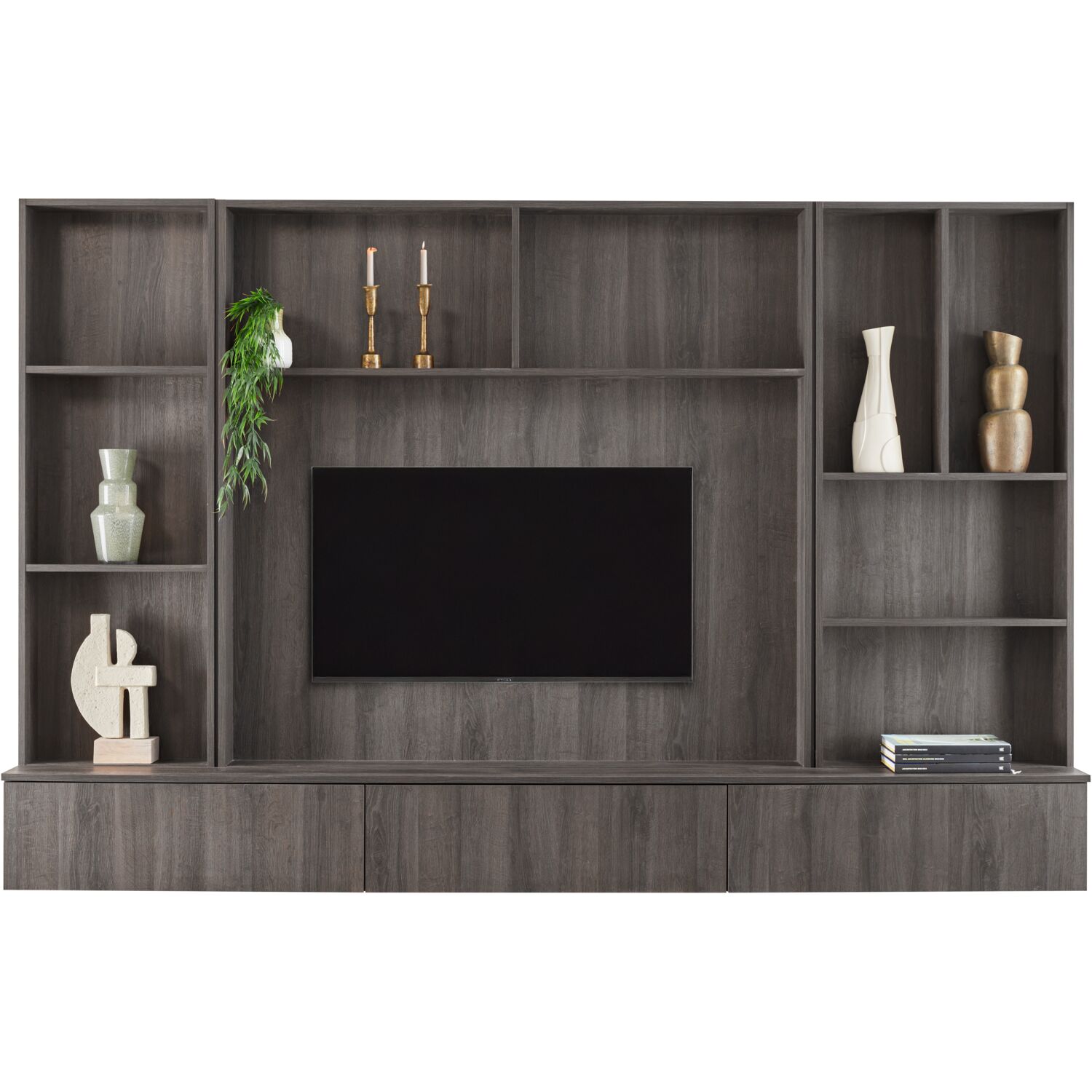 TV-kastenwand Arinta is onderdeel van een meubelserie met een eigentijdse en moderne uitstraling. Deze hangende TV-wall bestaat uit 3 kleppen die voorzien zijn van soft-close en push-to-open systeem en 10 open vakken. Dankzij de hoogwaardige Melamine afwerking in de kleur Sherman Oak is Arinta eenvoudig in onderhoud.