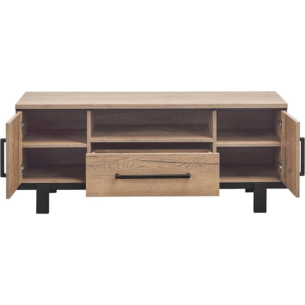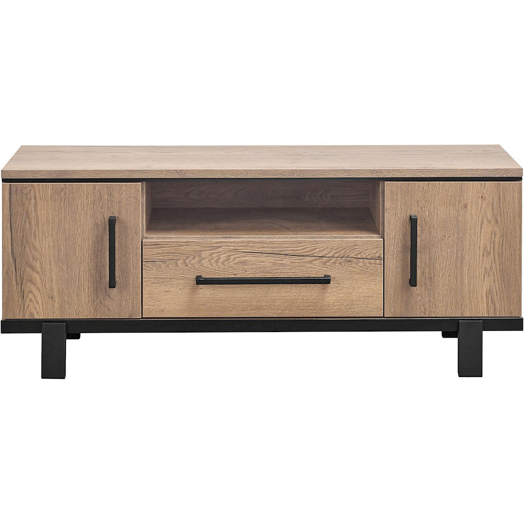 Het Adanti tv-meubel is een trendy kast met een industriële uitstraling. De warme, lichtbruine kleur en het gepoedercoate zwart metalen frame zorgen voor een unieke sfeer in je woonkamer. Deze robuuste kast is afgewerkt met een melamine toplaag. De toplaag ziet eruit als echt hout en heeft zelfs een licht reliëf, waardoor het ook aanvoelt als echt hout. Het materiaal is kras-, slijt- en stootvast, eenvoudig in onderhoud en gebruiksvriendelijk. Hierdoor is het tv-meubel ook bijzonder geschikt voor gezinnen met (jonge) kinderen.