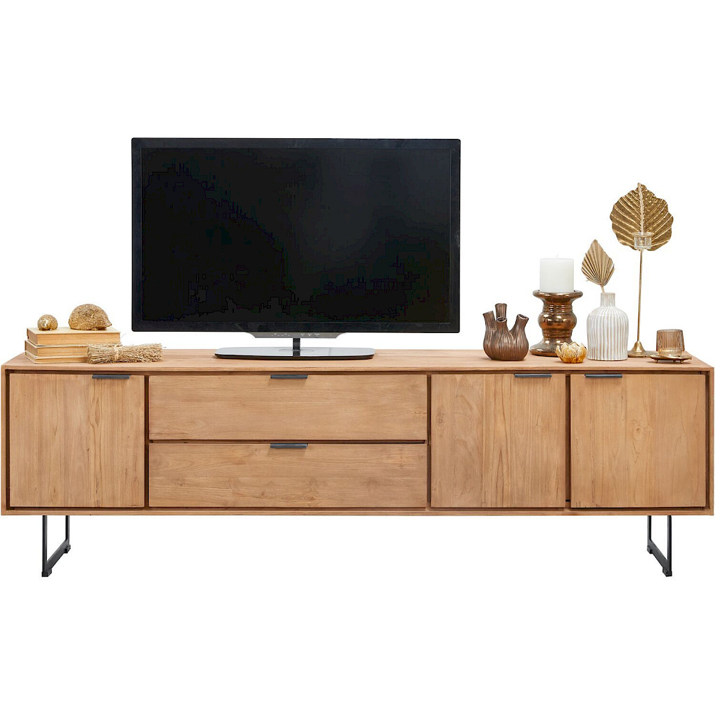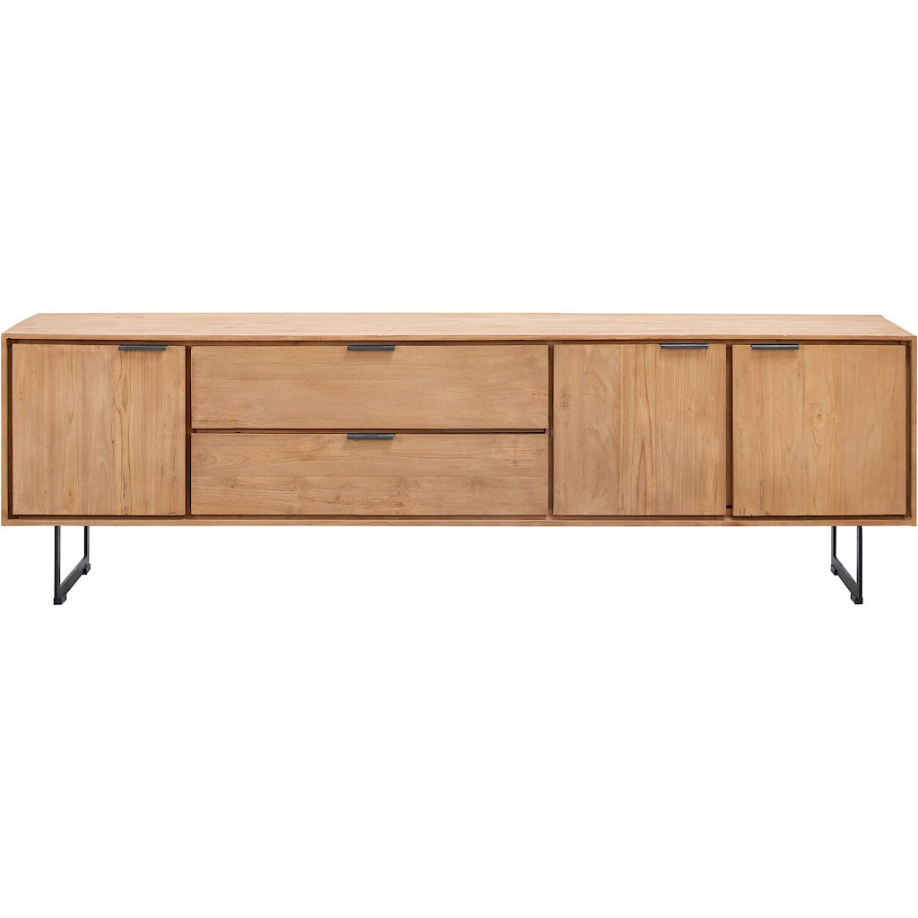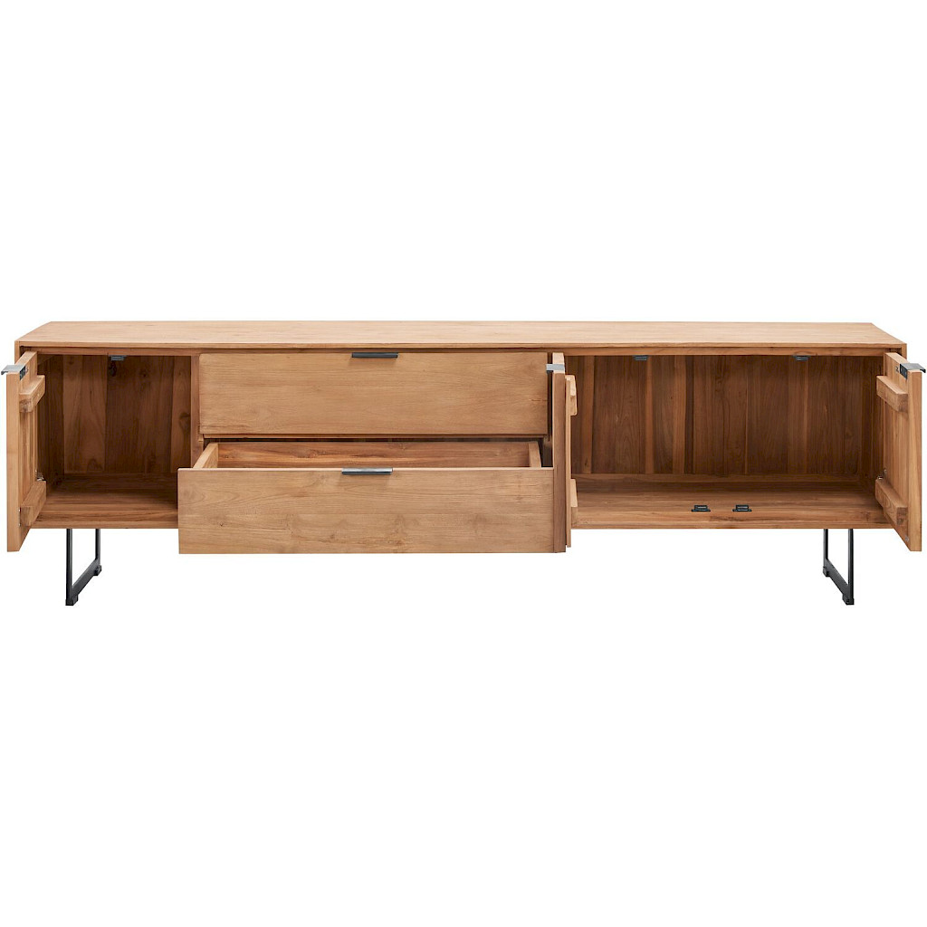 Tv-meubel Aska heeft een hoogte van 59 cm en een breedte van 195 cm. De combinatie van drie deuren, een lade en een klep biedt niet alleen voldoende opbergruimte voor al je media-apparatuur, afstandsbedieningen en kabels, maar geeft dit meubel ook een veelzijdige uitstraling. Het tv-meubel is voorzien van een ronde opening voor de kabeldoorvoer. De kast wordt opgebouwd aangeleverd, waardoor je snel van je nieuwe meubelstuk kunt genieten. Je hoeft alleen het metalen frame te monteren, met de bijgesloten montagehandleiding is dit zo gebeurd.