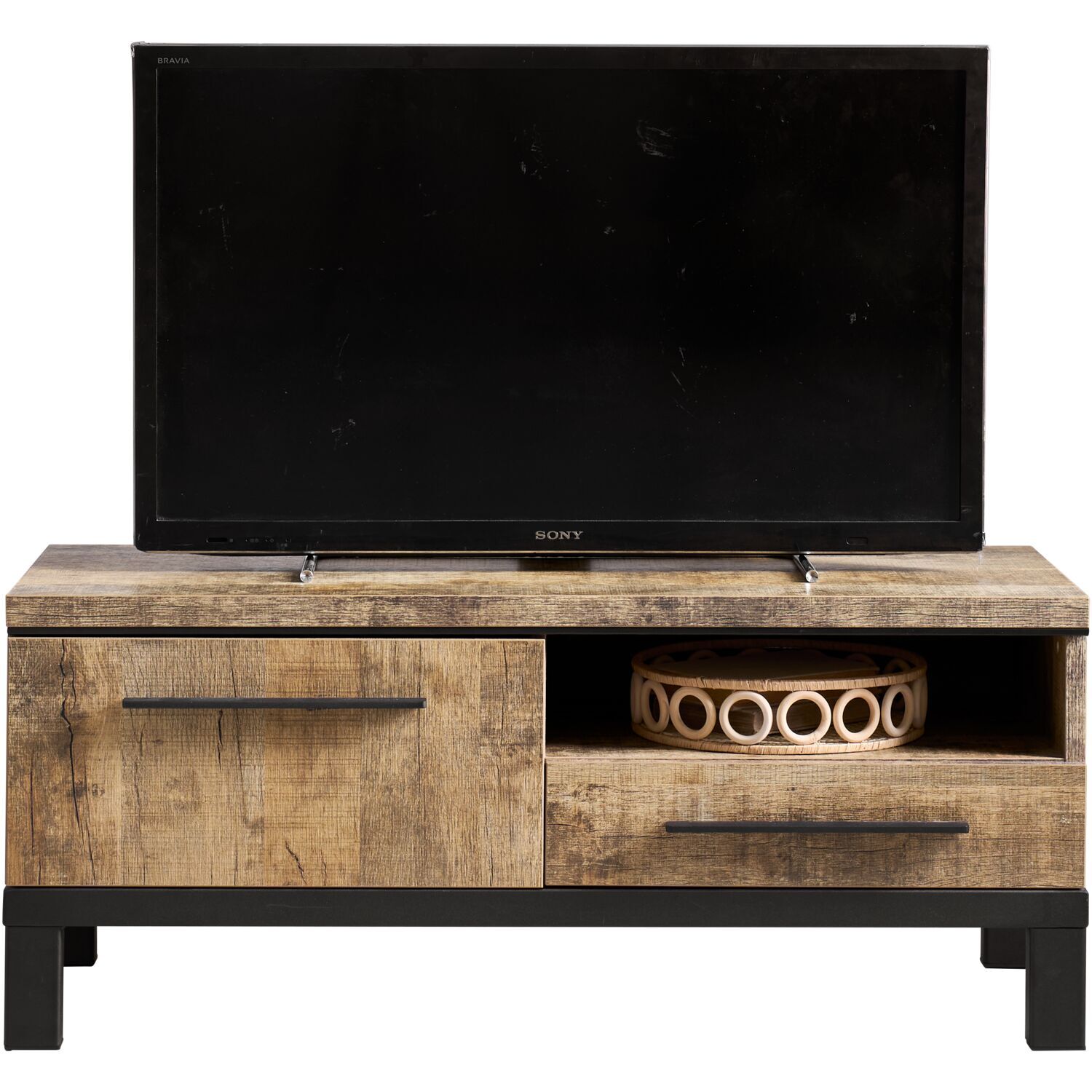 De combinatie van het zwart metalen frame en de kleur oriënt decor geeft het TV-meubel een robuust karakter. Het meubel is uitgevoerd in Lamulux. Lamulux is een materiaalontwikkeling gebaseerd op houtvezelplaat en melamine en wordt bij onze meubelen gebruikt als toplaag. Het is sterk, hard en minder gevoelig voor krassen. Door de aangebrachte houttekening en -structuur, heeft het dezelfde karakteristieke kenmerken van massief hout. Het ziet er niet alleen uit als echt hout, het voelt ook nog eens zo!