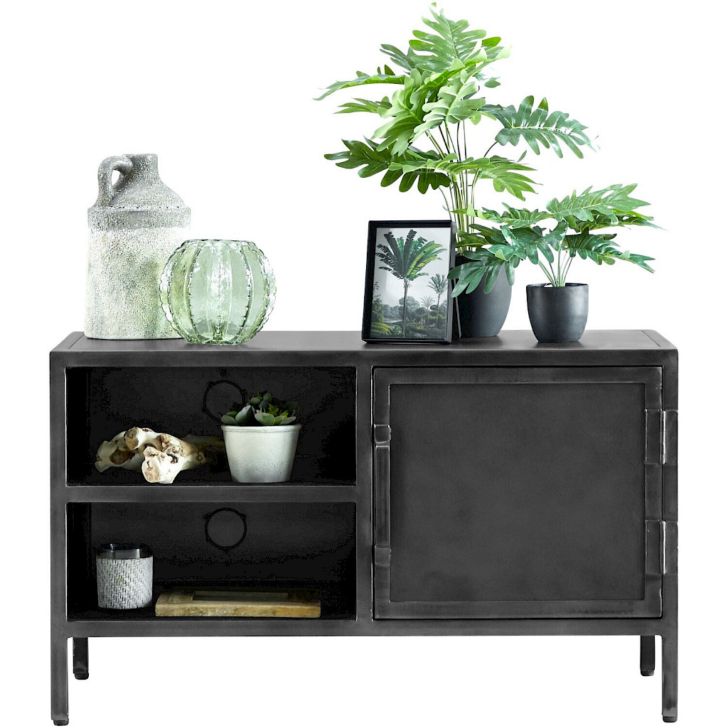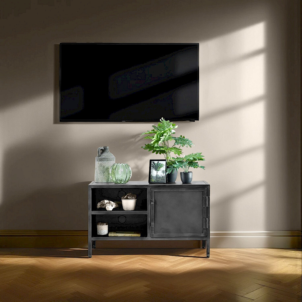 Dit is het kleinste TV-Meubel in de Carpino serie met een breedte van 92cm. Het TV-Meubel is 54cm hoog en de diepte is 40cm. Het is opgebouwd met een stevig stalenframe dat voorzien is van plaatstaal. De afmetingen van de open vakken zijn 17x42x40 (hxbxd). Het open vak is daarnaast voorzien van een afsluitbare ronde opening voor de kabeldoorvoer.