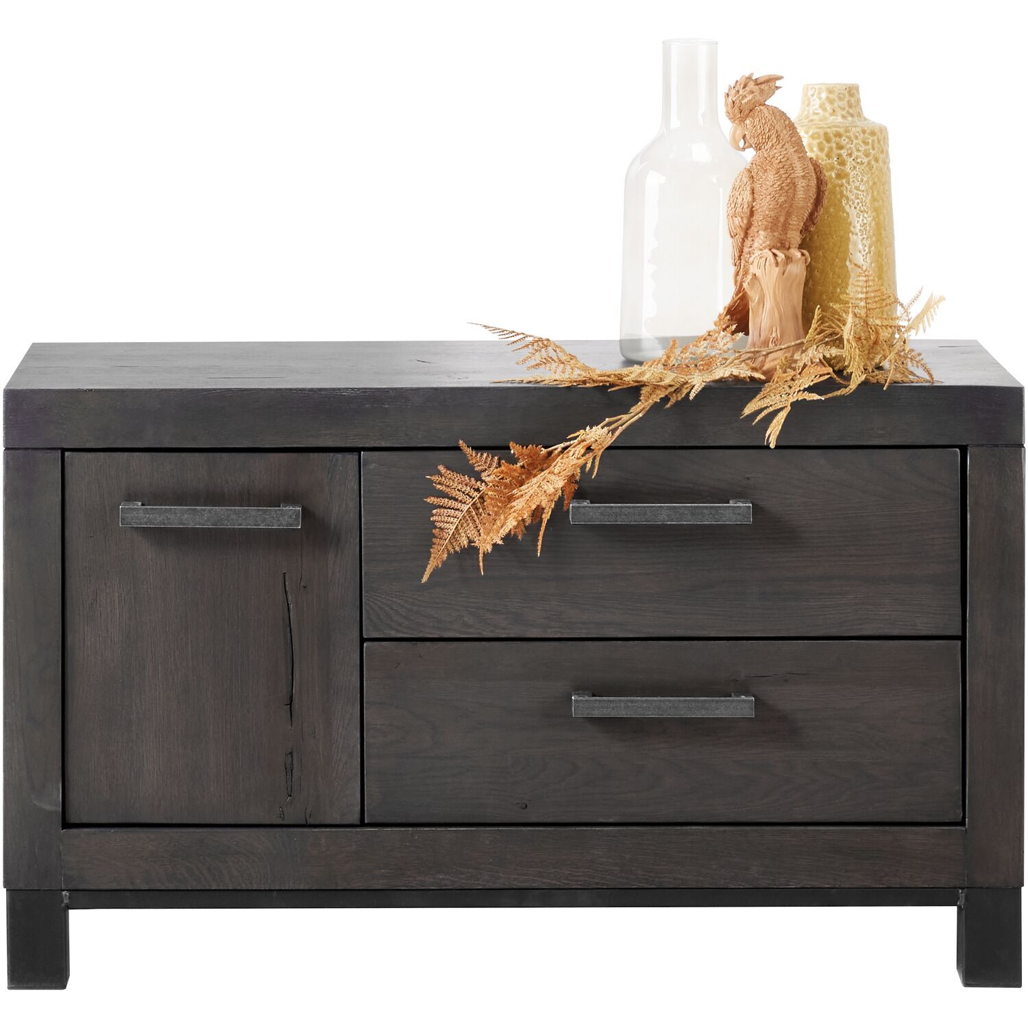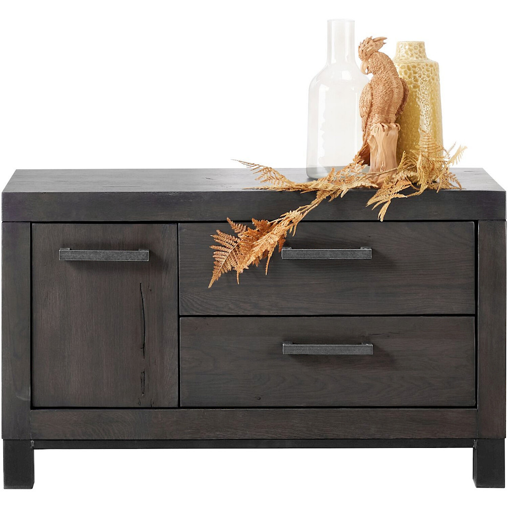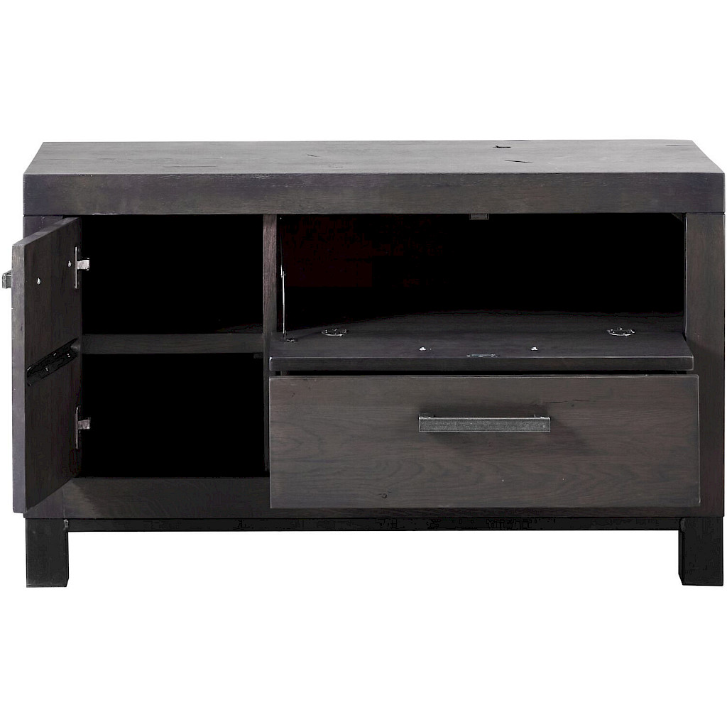 Dit robuuste tv-meubel Hevano is gemaakt van eikenhout met een grof gelast stalen onderstel. Eikenhout kenmerkt zich door de fijne nerf, vlamtekening en de wisselende kleurschakering. Elke boom heeft een eigen uitstraling door de groei en weersinvloeden. Structuur, nerfschakering, windbarstjes, haarscheurtjes en de aanwezigheid van grote en kleine knoesten getuigen van jarenlange groei en maken het hout van de boom authentiek.
