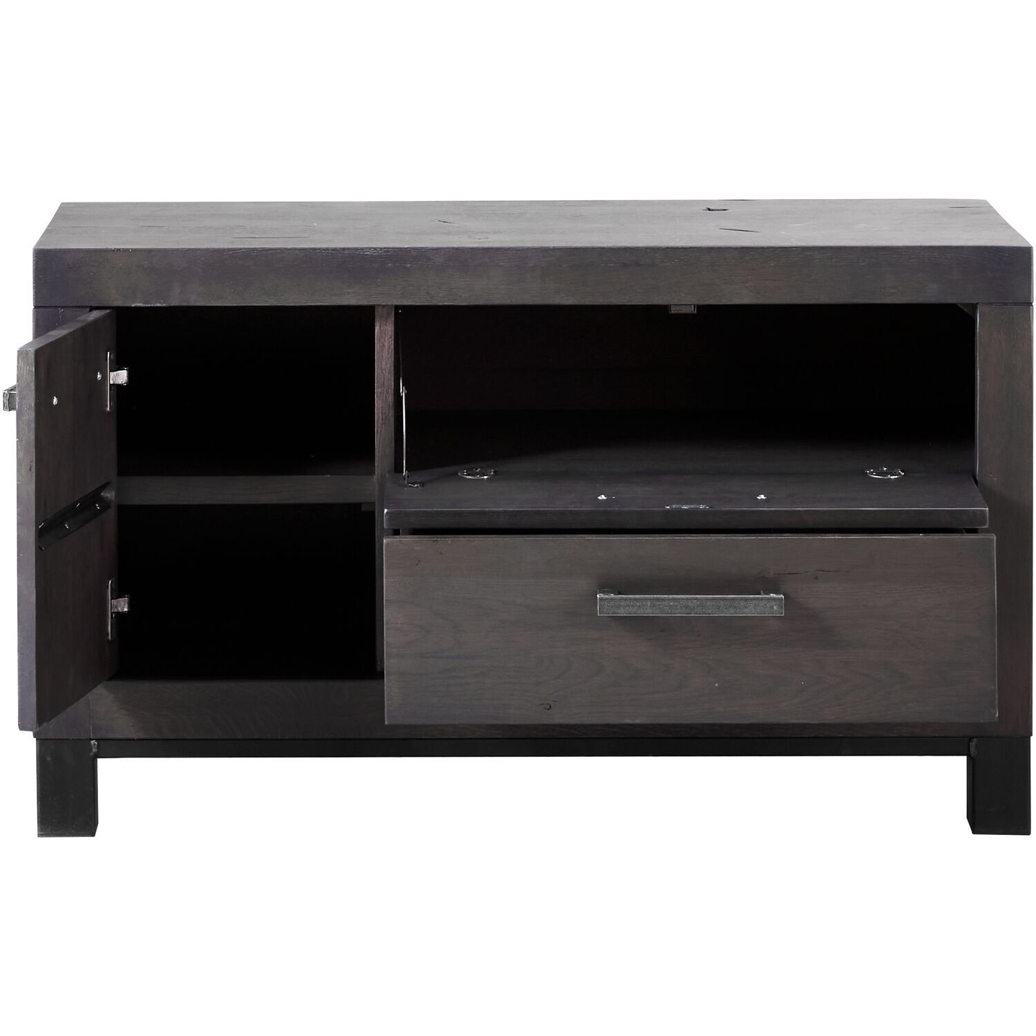 Dit tv-meubel is voorzien van 1 deur, 1 lade en 1 klep en is afgewerkt met een lak in de kleur Grafiet. Achter de deuren vind je een legplank. Daarnaast is dit tv-meubel voorzien van een opening aan de achterzijde voor het doorvoeren van kabels. Het tv-meubel wordt voorgemonteerd geleverd en is uitstekend te combineren met de andere meubelen uit de Hevano.