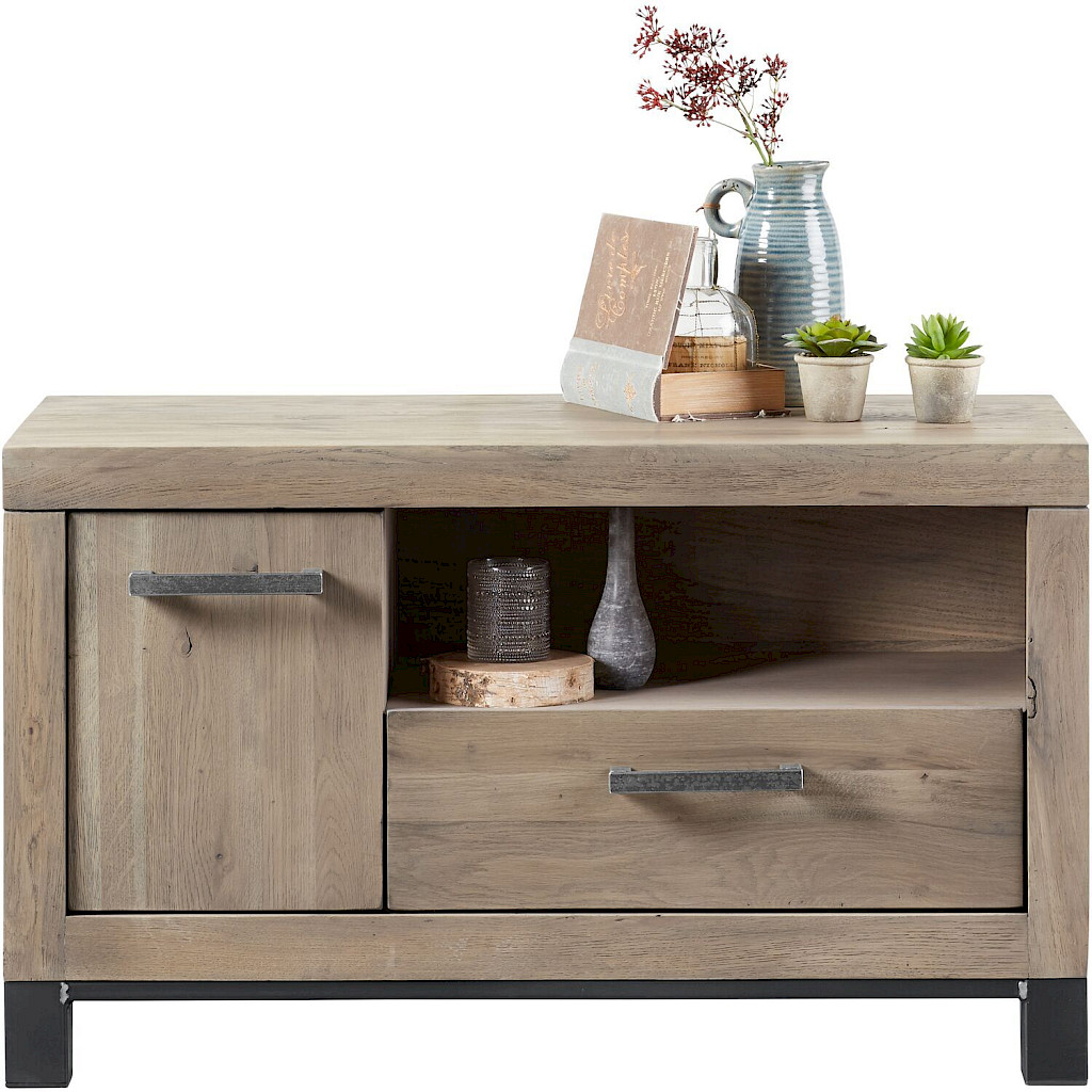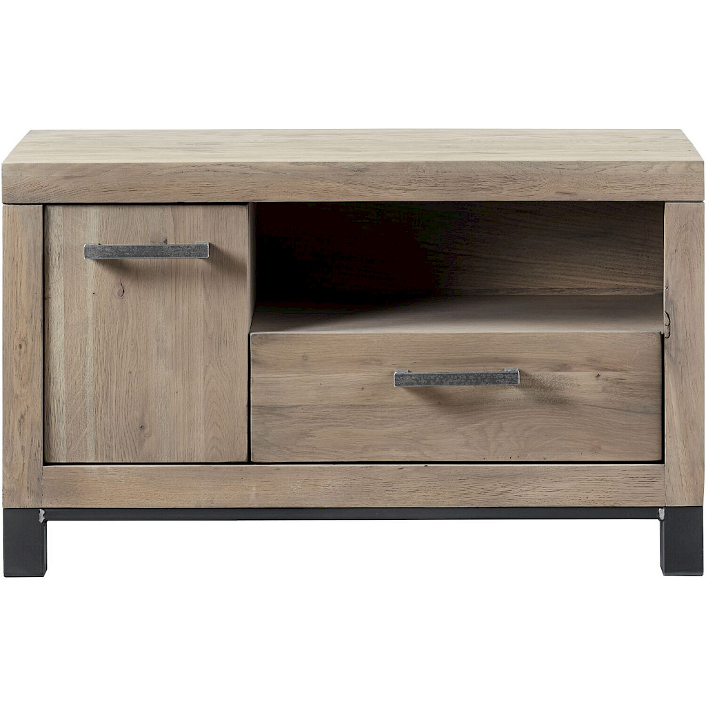 Dit tv-meubel is voorzien van 1 deur, 1 lade en een open vak en is afgewerkt met een olie in de kleur Moose. De afmetingen van het open vak zijn H19xB60xD43cm. Achter de deuren vind je een legplank. Daarnaast is dit tv-meubel voorzien van een opening aan de achterzijde voor het doorvoeren van kabels. Het tv-meubel wordt voorgemonteerd geleverd en is uitstekend te combineren met de andere meubelen uit de Hevano.
