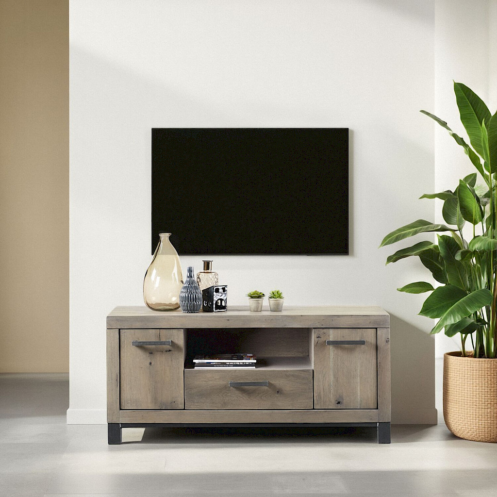 Dit tv-meubel is voorzien van 2 deuren, 1 lade en een open vak en is afgewerkt met een olie in de kleur Moose. De afmetingen van het open vak zijn H19xB60xD43cm. Achter de deuren vind je een legplank. Daarnaast is dit tv-meubel voorzien van een opening aan de achterzijde voor het doorvoeren van kabels. Het tv-meubel wordt voorgemonteerd geleverd en is uitstekend te combineren met de andere meubelen uit de Hevano.