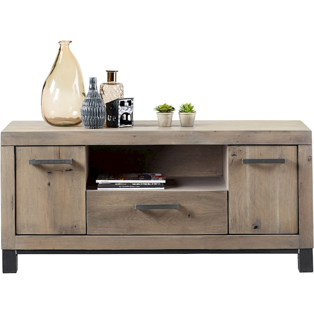 Dit robuuste tv-meubel Hevano is gemaakt van eikenhout met een grof gelast stalen onderstel. Eikenhout kenmerkt zich door de fijne nerf, vlamtekening en de wisselende kleurschakering. Elke boom heeft een eigen uitstraling door de groei en weersinvloeden. Structuur, nerfschakering, windbarstjes, haarscheurtjes en de aanwezigheid van grote en kleine knoesten getuigen van jarenlange groei en maken het hout van de boom authentiek.