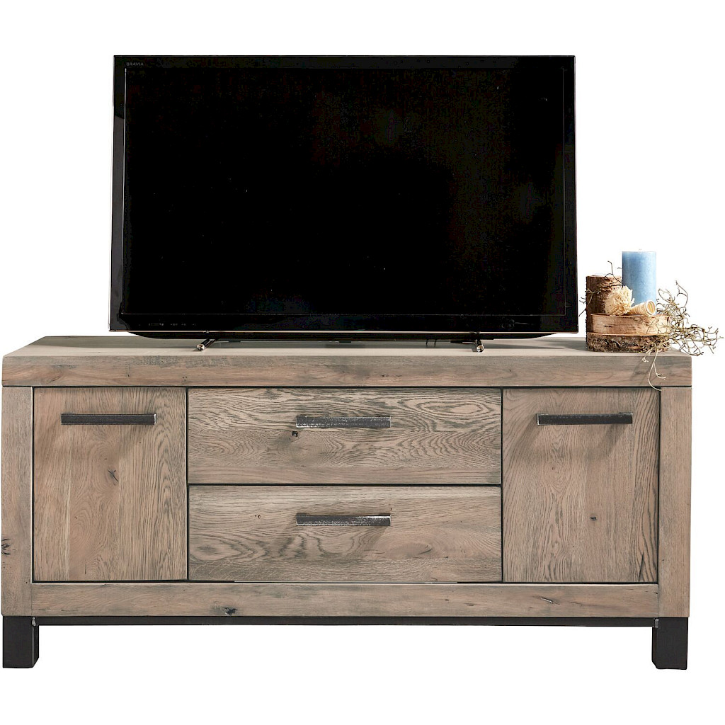 Dit robuuste tv-meubel Hevano is gemaakt van eikenhout met een grof gelast stalen onderstel. Eikenhout kenmerkt zich door de fijne nerf, vlamtekening en de wisselende kleurschakering. Elke boom heeft een eigen uitstraling door de groei en weersinvloeden. Structuur, nerfschakering, windbarstjes, haarscheurtjes en de aanwezigheid van grote en kleine knoesten getuigen van jarenlange groei en maken het hout van de boom authentiek.