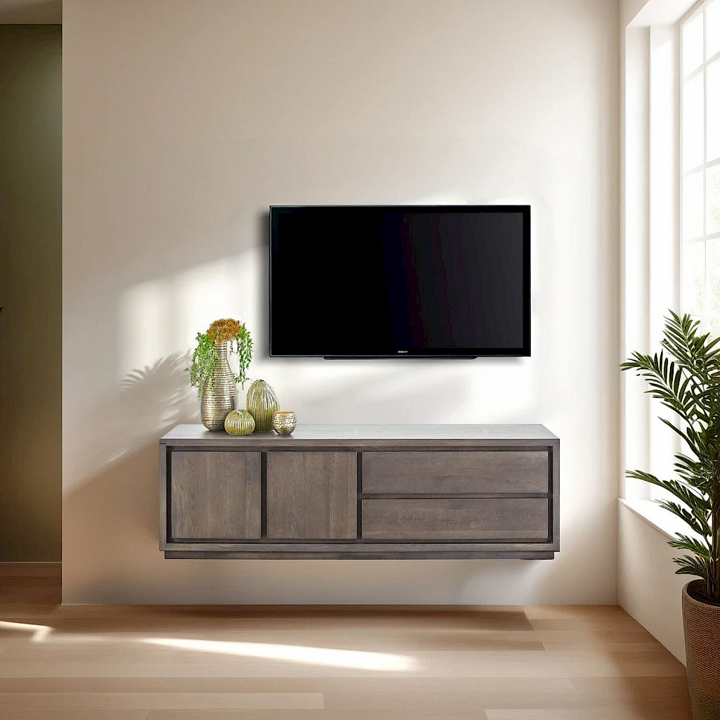 TV-meubel Lavio biedt met 2 deuren, 1 lade en 1 klep behoorlijk wat opbergruimte. Het vak met de klep is aan de achterzijde voorzien van een ronde opening voor de kabeldoorvoer. Achter de deuren zit 1 legplank. Zowel de deuren als de lade zijn voorzien van push open. Het meubel is voorgemonteerd, het kan zowel staand als hangend toegepast worden.