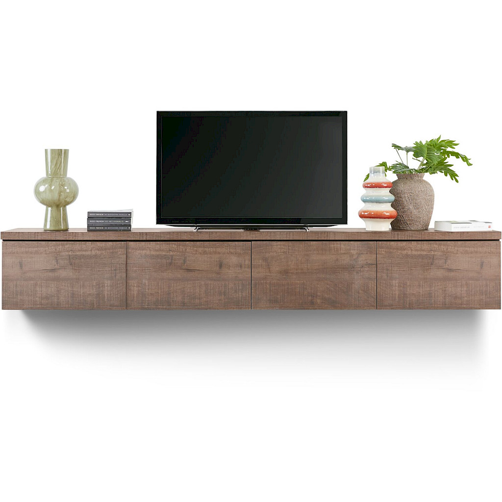 Model Lorina kenmerkt zich door zijn moderne en tijdloze uitstraling. Dit hangende TV-meubel bestaat uit 4 kleppen voorzien zijn van een handig push-to-open systeem. Dankzij de hoogwaardige Lamulux afwerking in Dark Mango heeft Lorina de uitstraling en het gevoel van echt hout, maar is zeer kras-, slijt- en stootvast en makkelijk in onderhoud.