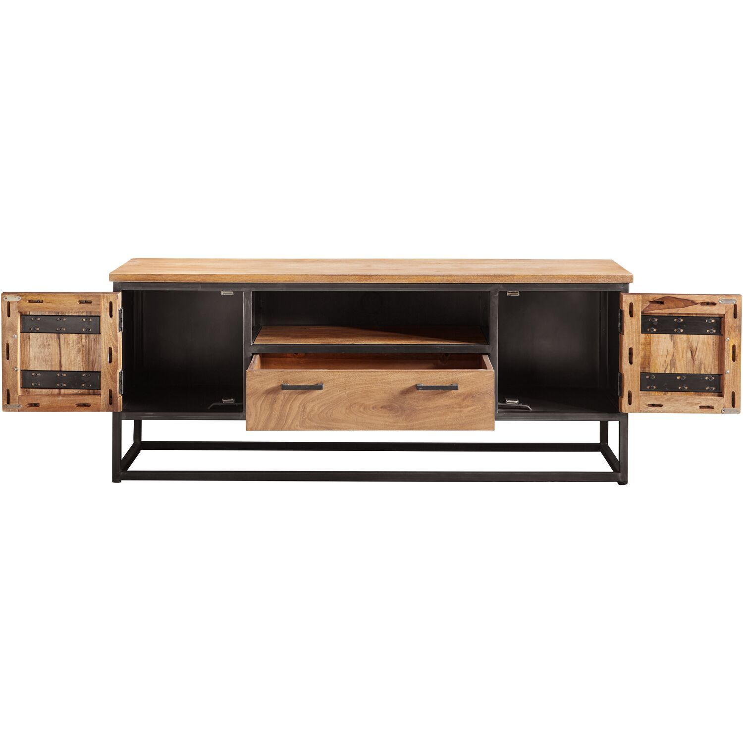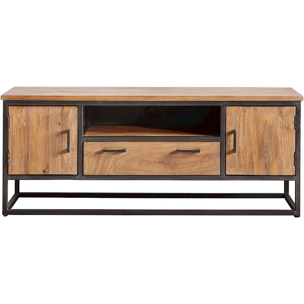 Tv-meubel Mesola is een trendy kast met een industriële uitstraling. De warme, lichtbruine kleur en het metalen frame zorgen voor een unieke sfeer in je woonkamer. Deze robuuste kast is gemaakt van massief mangohout. Dit hout heeft een natuurlijke uitstraling met verschillende lijnen, nerven en kleurschakeringen. Hierdoor is ieder meubel uniek. Het hout is afgewerkt met een transparante lak, zodat er niet snel vlekken op ontstaan en het onderhoud eenvoudig is.